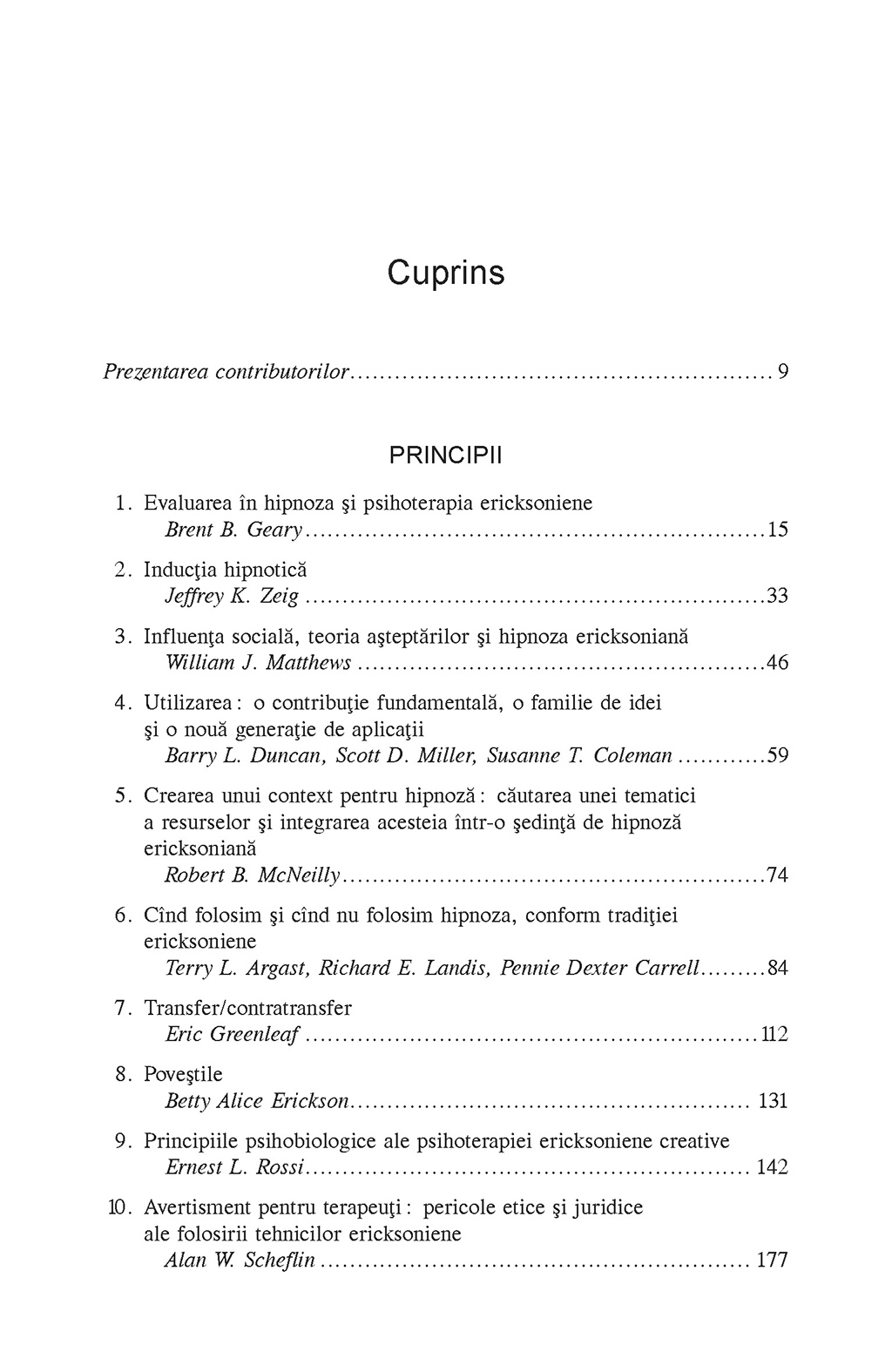 Din cuprins: Evaluarea în hipnoza şi psihoterapia ericksoniene • Inducţia hipnotică • Cînd folosim şi cînd nu folosim hipnoza, conform tradiţiei ericksoniene • Avertisment pentru terapeuţi: pericole etice şi juridice ale folosirii tehnicilor ericksoniene • Tulburările de anxietate • Terapia strategică, centrată pe soluţii, a depresiei • Abordări ericksoniene ale managementului durerii • Abordări ericksoniene ale afecţiunilor psihosomatice • Abordări ericksoniene ale tulburărilor disociative • Dependenţele • Lucrul indirect cu cuplurile • Ludoterapia ericksoniană: spiritul vindecării la copii şi adolescenţi