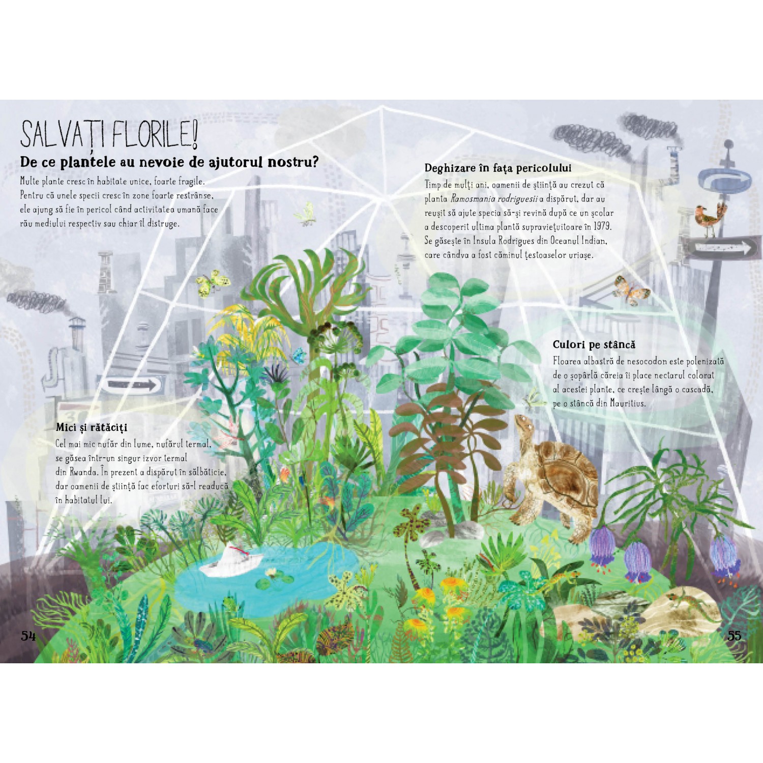 În paginile de început, cititorii vor învăța totul despre botanică, inclusiv cum să recunoască diferite tipuri de flori. Paginile următoare ilustrează diferitele habitate care găzduiesc flora, cum ar fi plantele urcior, nuferii uriași și floarea-soarelui. Cititorii vor descoperi ce flori sunt pe cale de dispariție și de ce unele flori sunt parfumate sau colorate, ca să nu mai vorbim despre detaliile fascinante ale florilor carnivore și otrăvitoare.