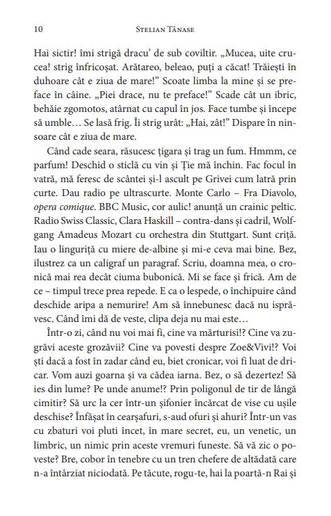 "A identificat de vinerea trecuta un SUV negru, aidoma cu cel care-l storcise de caldaram pe Zgaiba. Poate chiar acela. Lucios, scanteind negru sub un felinar. Vivi s-a apropiat. Nu avea emotii. A scos fara zgomot canistra din tescherea. Avea nevoie de fix 8 secunde. A rasucit dopul, s-a lipit de caroserie, a varsat continutul. A imprastiat benzina deasupra rezervorului. Avea imaginea in cateva planse de manual. A tras bricheta din buzunar si a deschis-o. A pus iute foc. A durat 12 secunde sa se aprinda. A asteptat calm sa se ridice valvataia, a privit-o concentrat, ca in copilaria lui, cand se lasa fascinat de foc. L-ar fi privit ore-ntregi. S-a retras cinci pasi, a scos Leica, a tras reflex. Masina ardea foarte frumos. A durat 7 minute pana a cautat din priviri bicicleta, a ridicat-o din iarba. S-a suit in sa, a clinchenit soneria, salut. A apasat pedala si a disparut in noapte. A lasat masina la trotuar, arzand. Ce noapte!"
