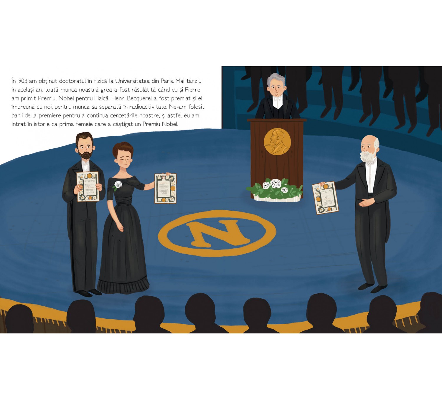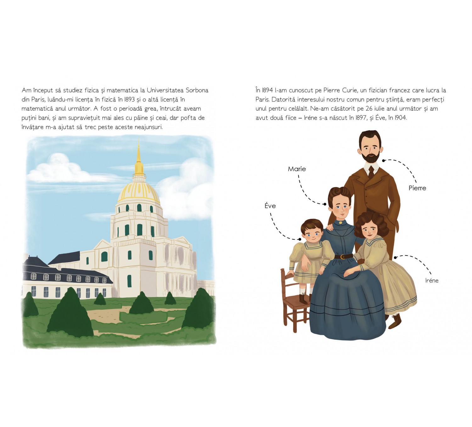 Ilustrații atrăgătoare, informații despre progresele și succesele ei și un index al evenimentelor majore dezvăluie modul în care Marie Curie și-a pus amprenta asupra umanității. O cronologie și un test simplu la sfârșitul cărții îi ajută pe copii să-și testeze înțelegerea și cunoștințele.