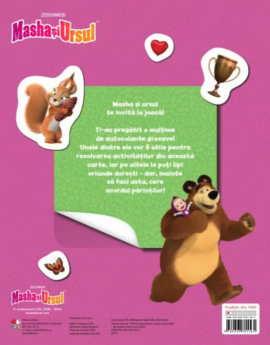 Masha și ursul te invită la joacă! Ți-au pregătit o mulțime de autocolante grozave! Unele dintre ele vor fi utile pentru rezolvarea activităților din această carte, iar pe altele le poți lipi oriunde dorești – dar, înainte să faci asta, cere acordul părinților!