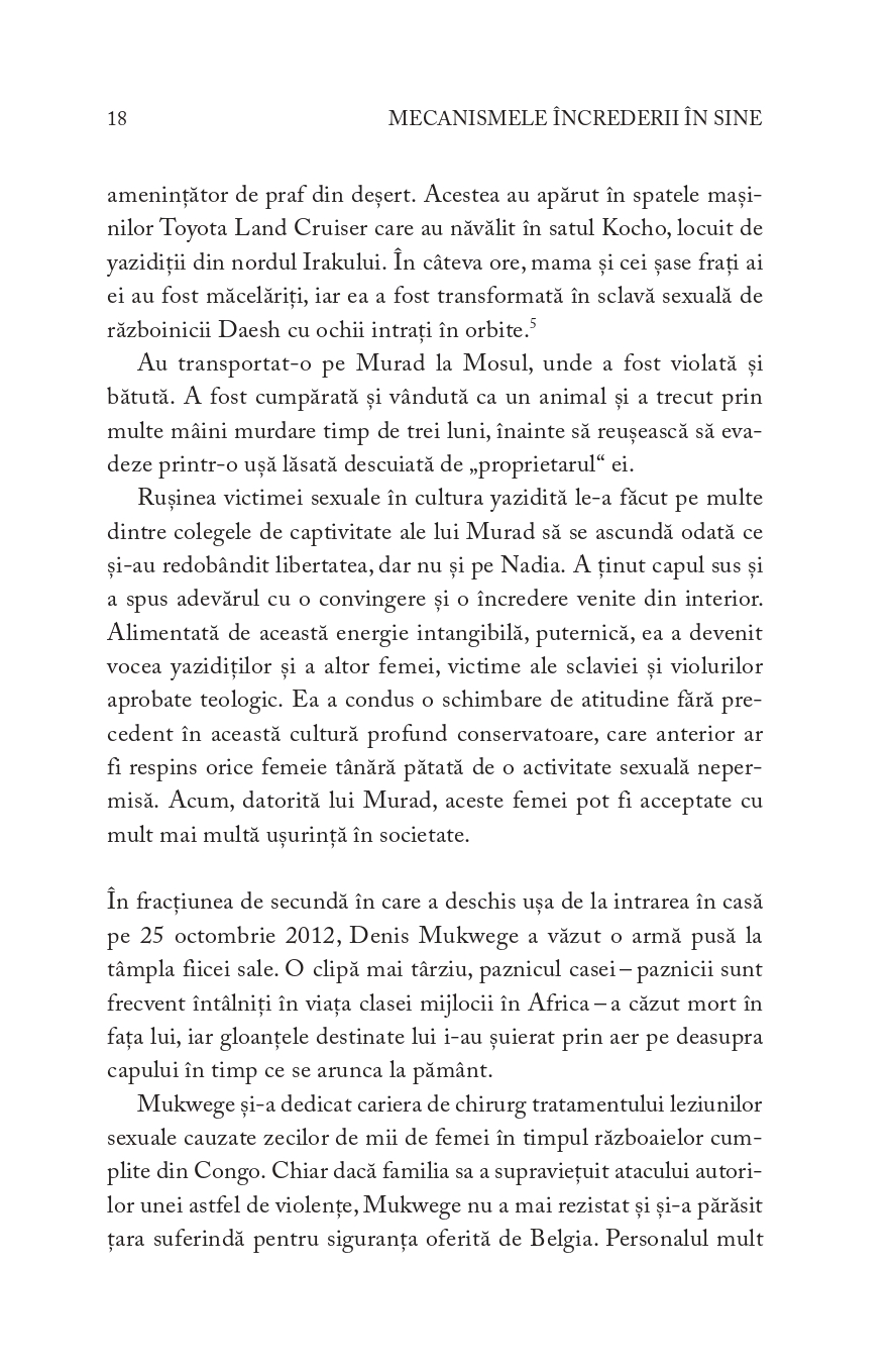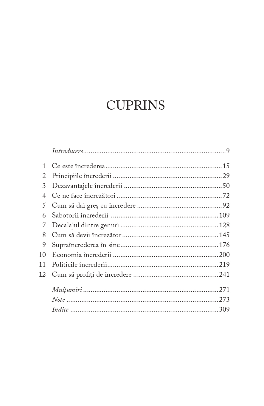 Vom afla de unde vine și cum se propagă încrederea, care sunt consecințele ei economice și politice, de ce unii o posedă și alții nu, cum lipsa ei ne afectează sănătatea, care este dinamica încrederii la locul de muncă, acasă și în relațiile dintre sexe. Mai presus de toate, vom constata că încrederea nu este înnăscută, dar odată învățată și stăpânită ne va face mai puternici.