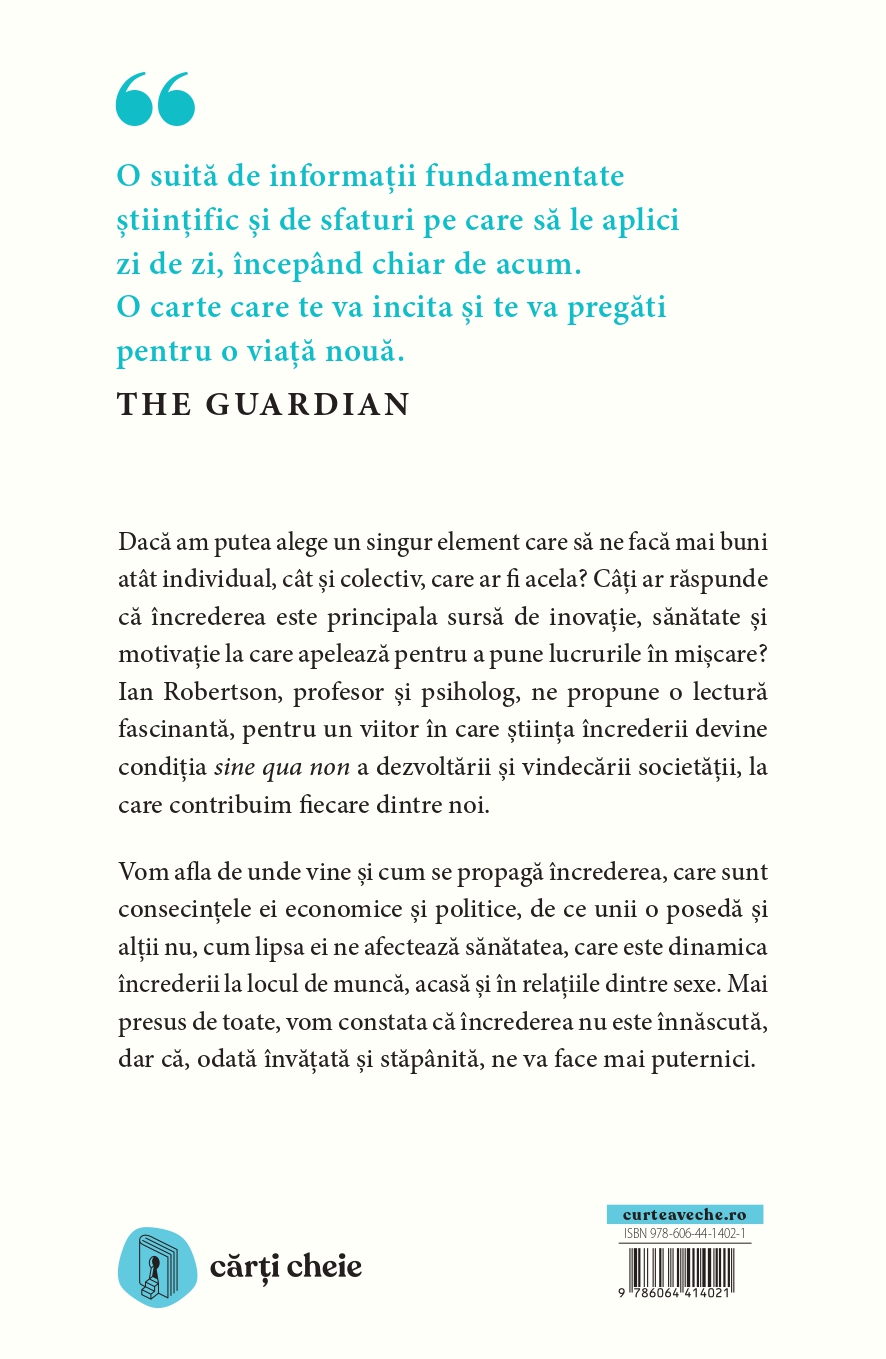 Ian Robertson, psiholog și profesor, ne oferă o lectură fascinantă pentru un viitor mai bun, în care știința încrederii devine condiția sine qua non a dezvoltării și vindecării societății, la care contribuim fiecare dintre noi.