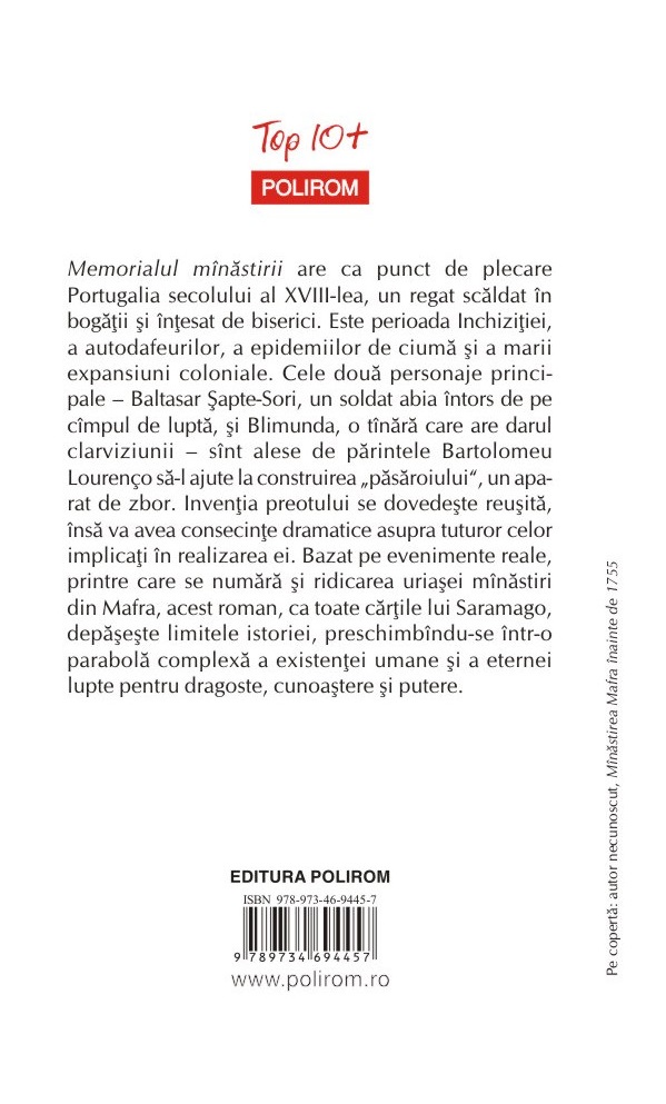 Memorialul mânăstirii are ca punct de plecare Portugalia secolului al XVIII-lea, un regat scăldat în bogăţii şi înţesat de biserici. Este perioada Inchiziţiei, a autodafeurilor, a epidemiilor de ciumă şi a marii expansiuni coloniale. Cele două personaje principale – Baltasar Şapte-Sori, un soldat abia întors de pe câmpul de luptă, şi Blimunda, o tânără care are darul clarviziunii – sunt alese de părintele Bartolomeu Lourenço să-l ajute la construirea „păsăroiului”, un aparat de zbor. Invenţia preotului se dovedeşte reuşită, însă va avea consecinţe dramatice asupra tuturor celor implicaţi în realizarea ei. Bazat pe evenimente reale, printre care se numără şi ridicarea uriaşei mânăstiri din Mafra, acest roman, ca toate cărţile lui Saramago, depăşeşte limitele istoriei, preschimbându-se într-o parabolă complexă a existenţei umane şi a eternei lupte pentru dragoste, cunoaştere şi putere.