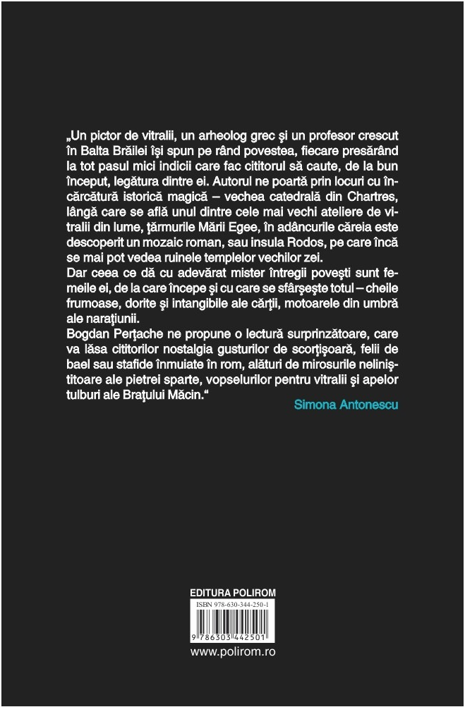 „Un pictor de vitralii, un arheolog grec și un profesor crescut în Balta Brăilei își spun pe rând povestea, fiecare presărând la tot pasul mici indicii care fac cititorul să caute, de la bun început, legătura dintre ei. Autorul ne poartă prin locuri cu încărcătură istorică magică – vechea catedrală din Chartres, lângă care se află unul dintre cele mai vechi ateliere de vitralii din lume, țărmurile Mării Egee, în adâncurile căreia este descoperit un mozaic roman, sau insula Rodos, pe care încă se mai pot vedea ruinele templelor vechilor zei.