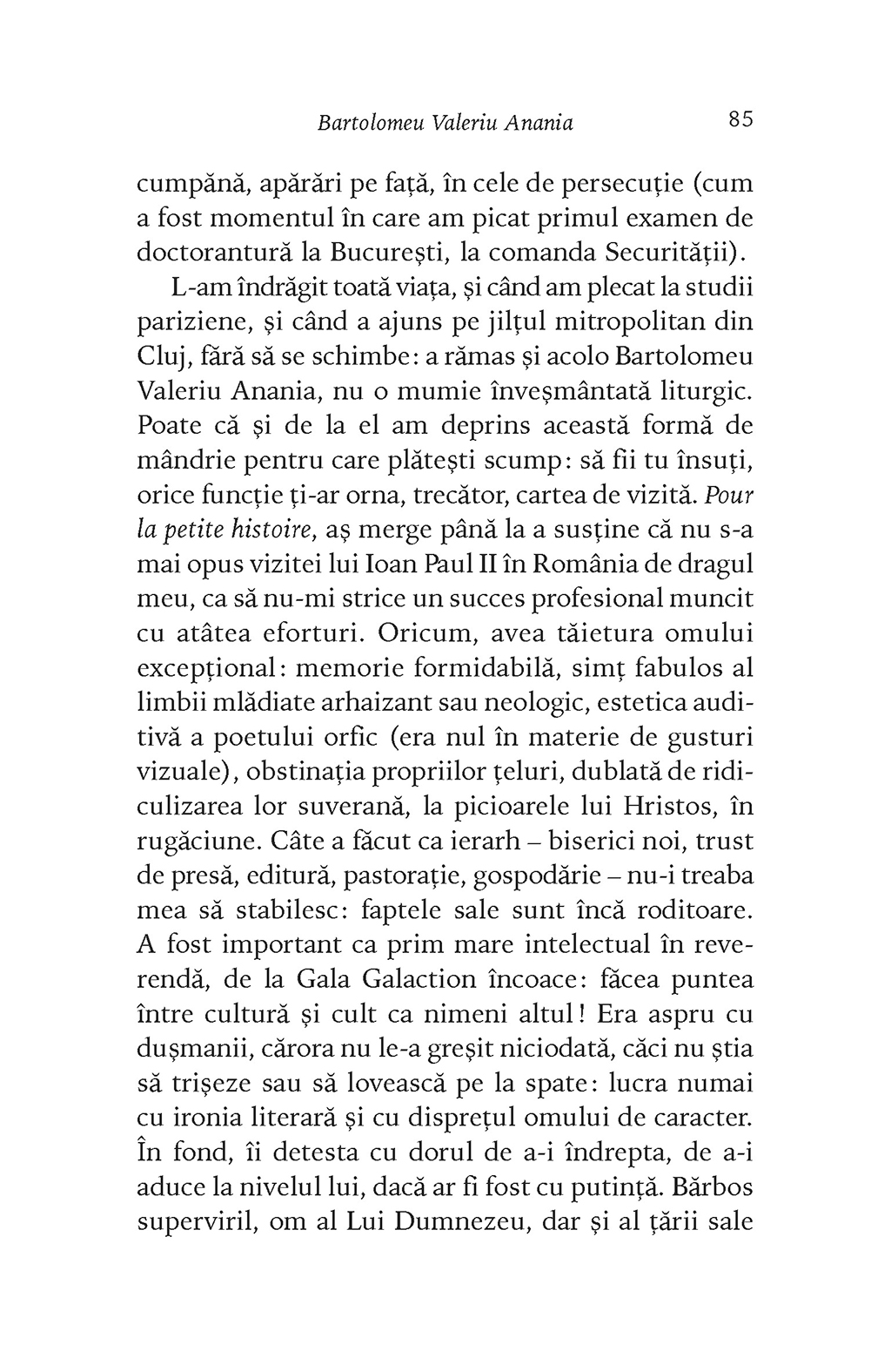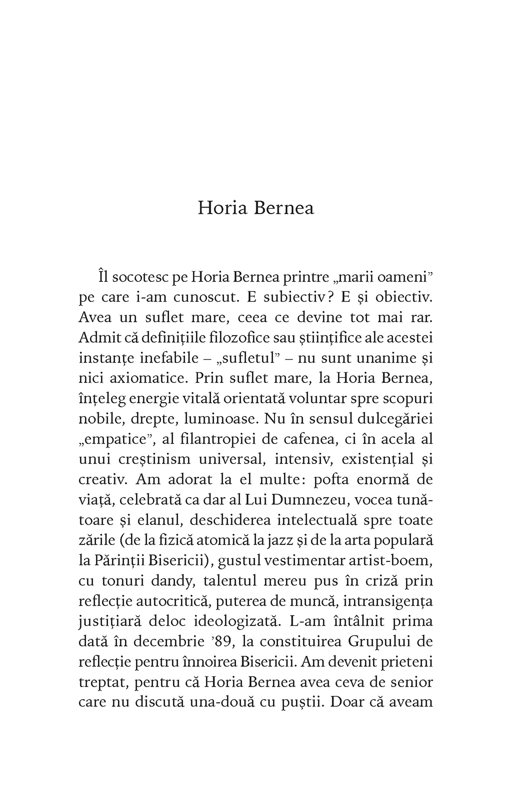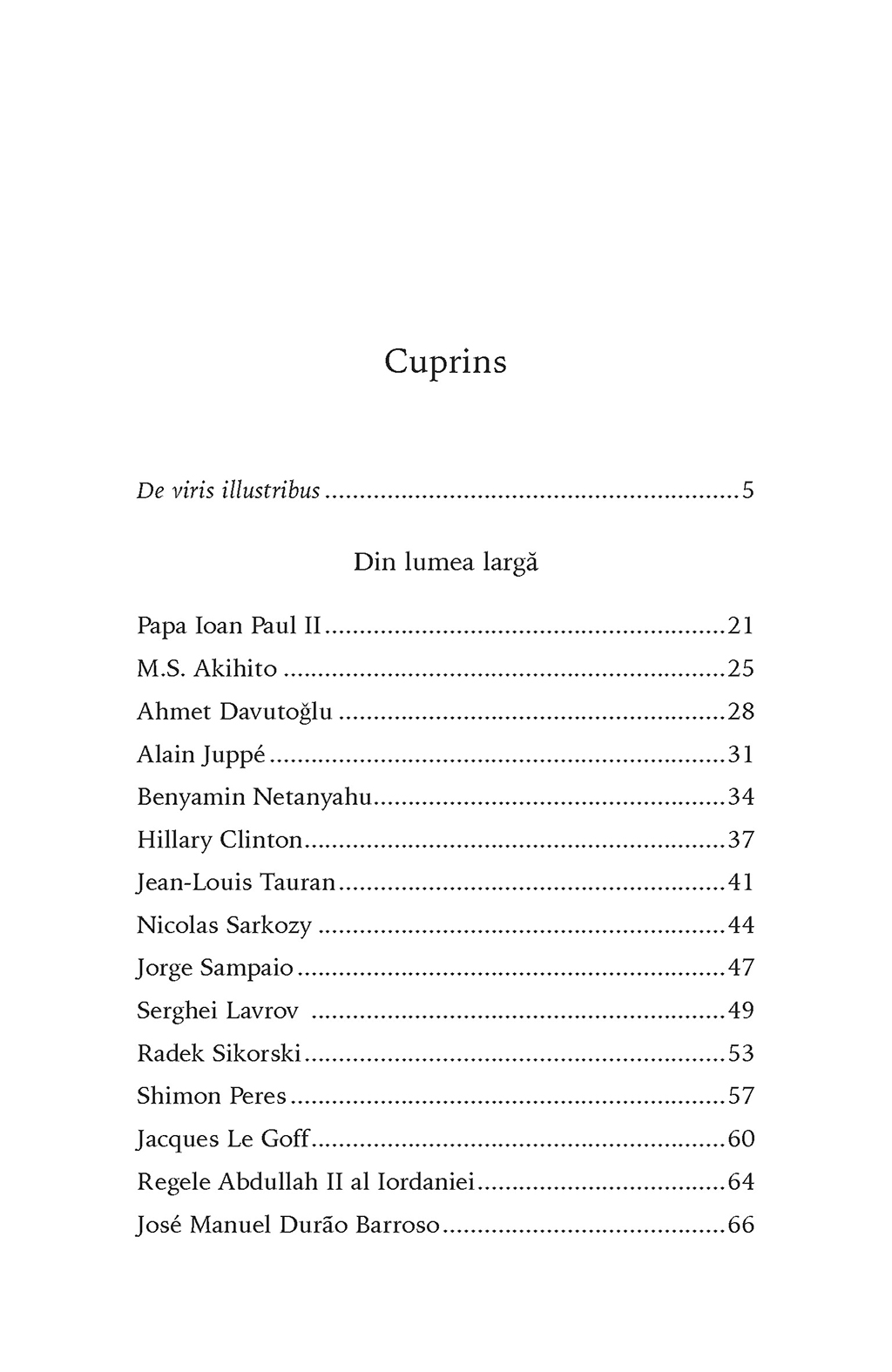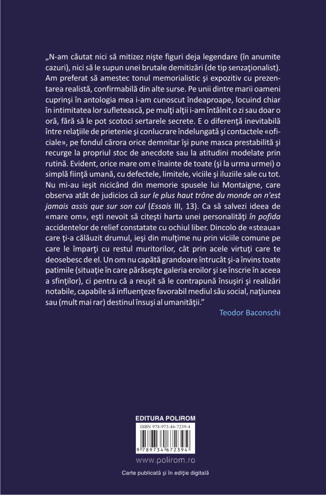 „N-am căutat nici să mitizez nişte figuri deja legendare (în anumite cazuri), nici să le supun unei brutale demitizări (de tip senzaţionalist). Am preferat să amestec tonul memorialistic şi expozitiv cu prezentarea realistă, confirmabilă din alte surse. Pe unii dintre marii oameni cuprinşi în antologia mea i-am cunoscut îndeaproape, locuind chiar în intimitatea lor sufletească, pe mulţi alţii i-am întîlnit o zi sau doar o oră, fără să le pot scotoci sertarele secrete. E o diferenţă inevitabilă între relaţiile de prietenie şi conlucrare îndelungată şi contactele «oficiale», pe fondul cărora orice demnitar îşi pune masca prestabilită şi recurge la propriul stoc de anecdote sau la atitudini modelate prin rutină. Evident, orice mare om e înainte de toate (şi la urma urmei) o simplă fiinţă umană, cu defectele, limitele, viciile şi iluziile sale cu tot. Nu mi-au ieşit nicicînd din memorie spusele lui Montaigne, care observa atît de judicios că sur le plus haut trône du monde on n’est jamais assis que sur son cul (Essais III, 13). Ca să salvezi ideea de «mare om», eşti nevoit să citeşti harta unei personalităţi în pofida accidentelor de relief constatate cu ochiul liber. Dincolo de «steaua» care ţi-a călăuzit drumul, ieşi din mulţime nu prin viciile comune pe care le împarţi cu restul muritorilor, cît prin acele virtuţi care te deosebesc de el. Un om nu capătă grandoare întrucît şi-a învins toate patimile (situaţie în care părăseşte galeria eroilor şi se înscrie în aceea a sfinţilor), ci pentru că a reuşit să le contrapună însuşiri şi realizări notabile, capabile să influenţeze favorabil mediul său social, naţiunea sau (mult mai rar) destinul însuşi al umanităţii.” (Teodor Baconschi)