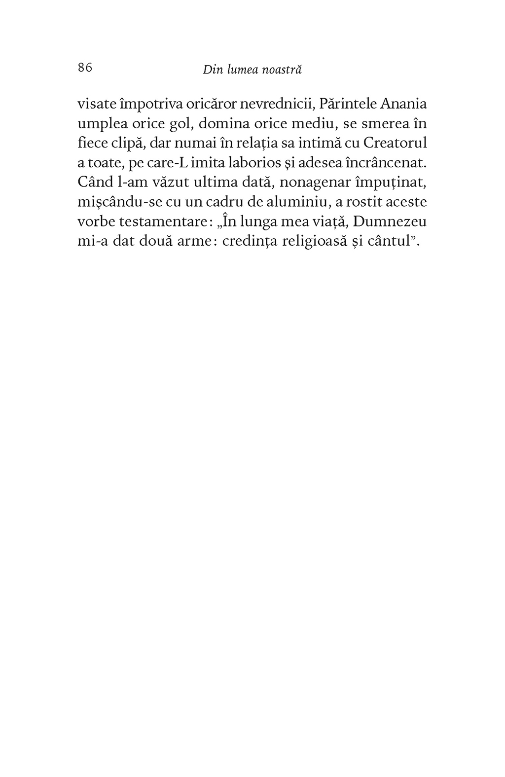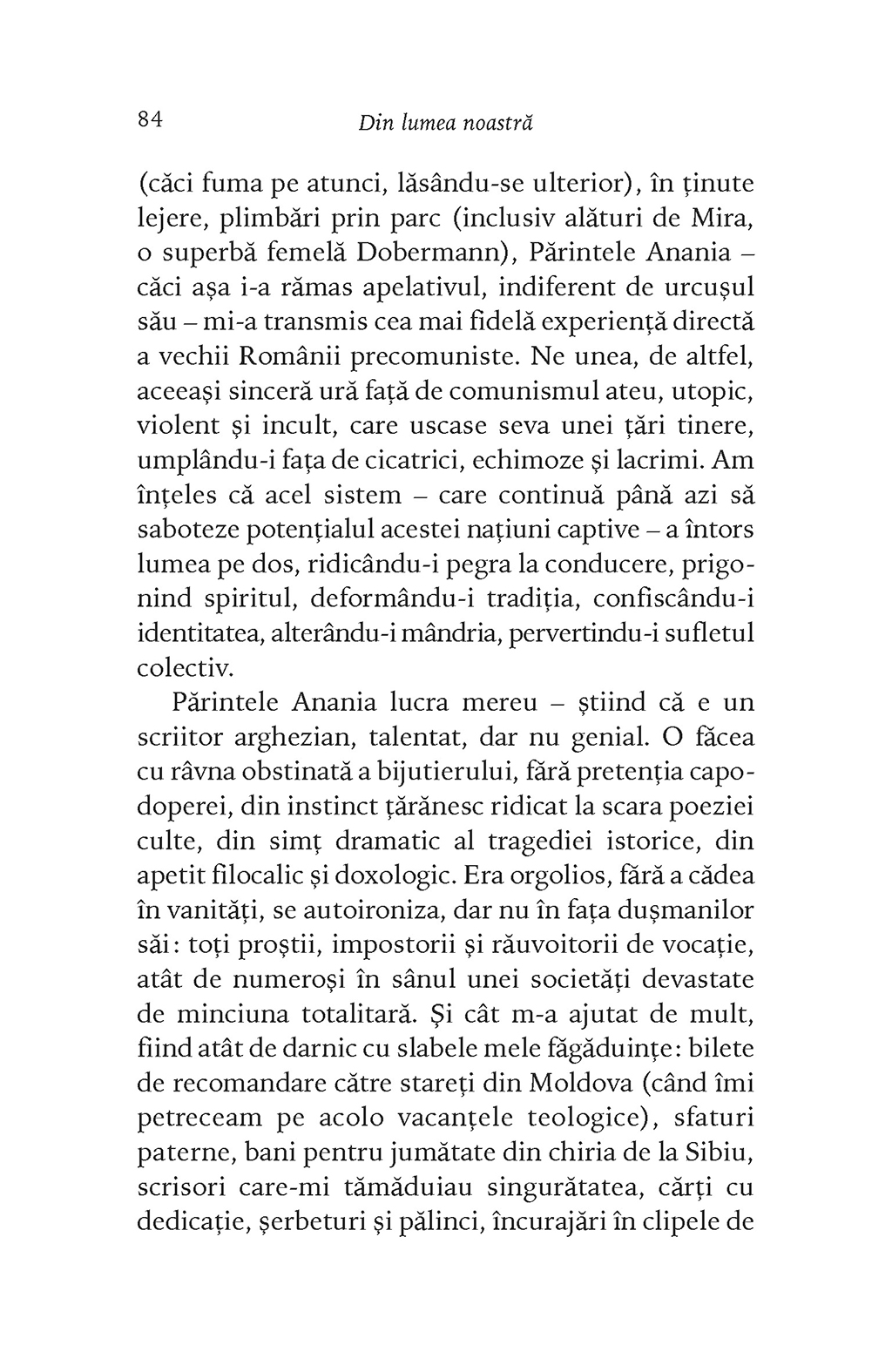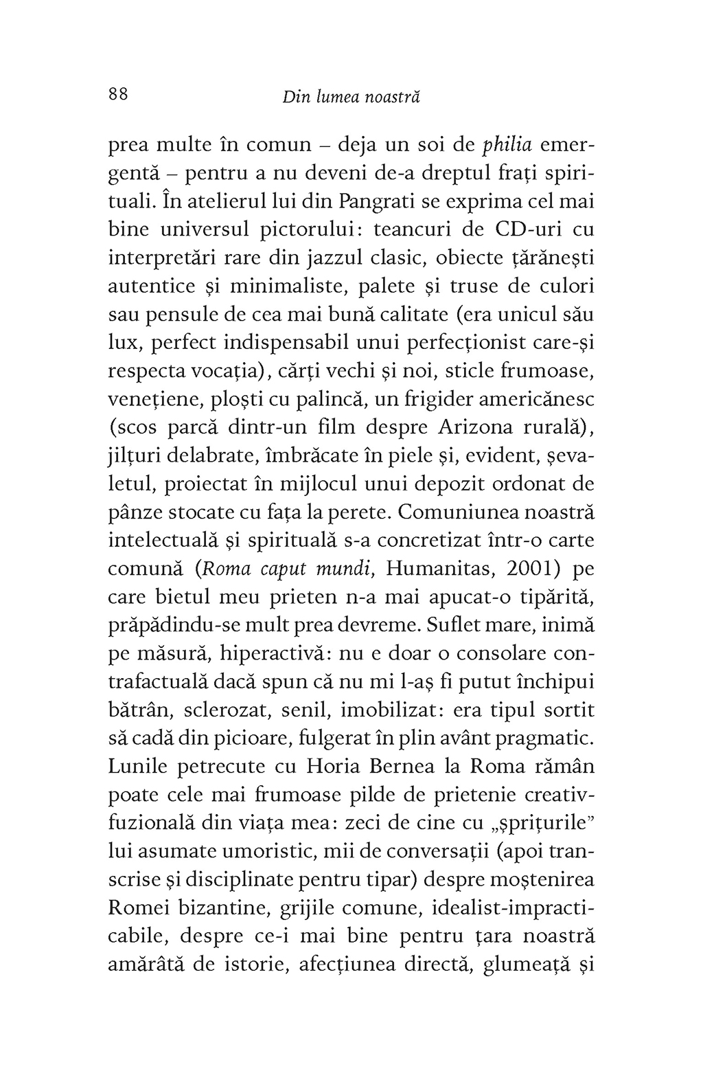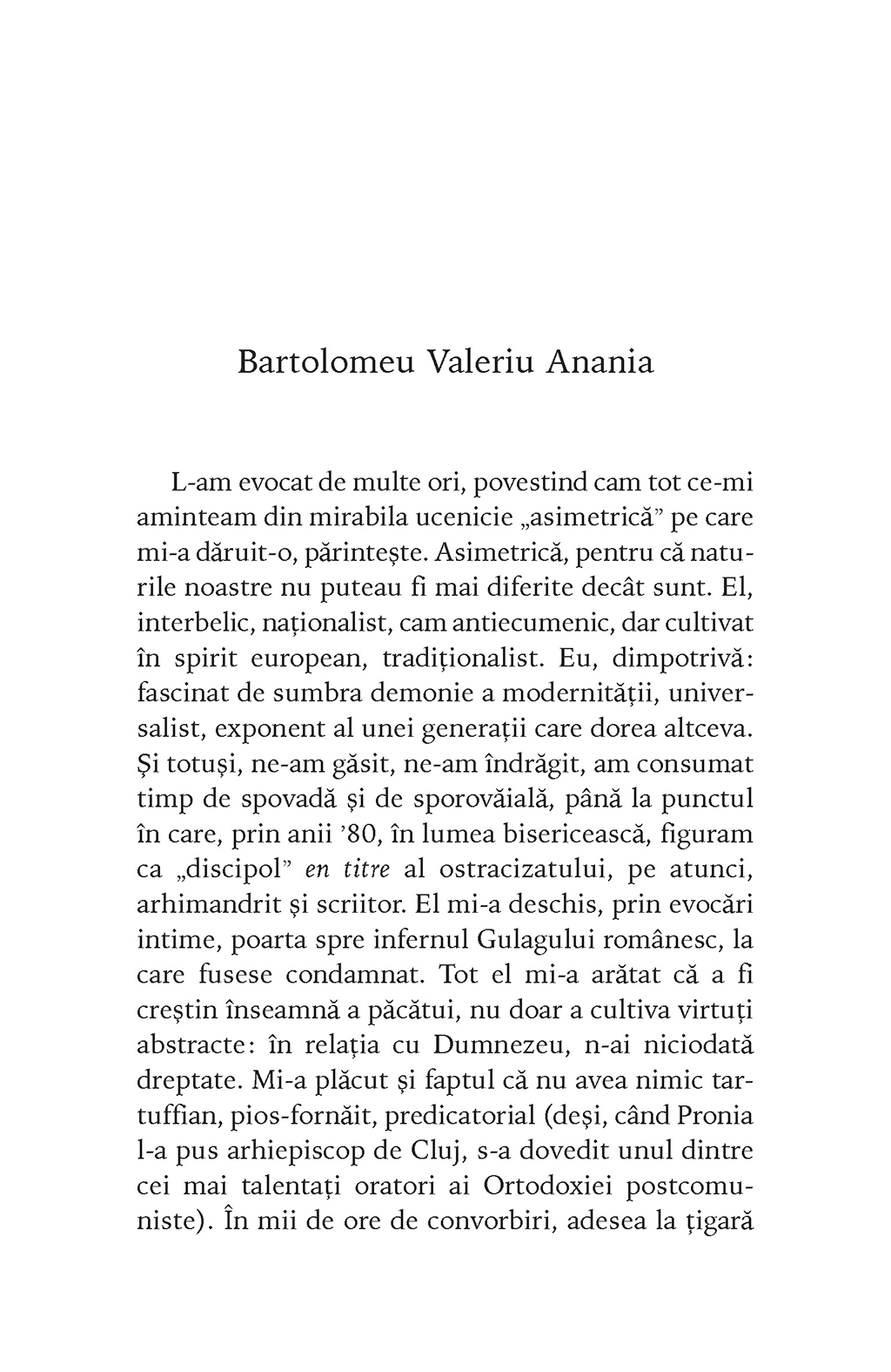 „N-am căutat nici să mitizez nişte figuri deja legendare (în anumite cazuri), nici să le supun unei brutale demitizări (de tip senzaţionalist). Am preferat să amestec tonul memorialistic şi expozitiv cu prezentarea realistă, confirmabilă din alte surse. Pe unii dintre marii oameni cuprinşi în antologia mea i-am cunoscut îndeaproape, locuind chiar în intimitatea lor sufletească, pe mulţi alţii i-am întîlnit o zi sau doar o oră, fără să le pot scotoci sertarele secrete. E o diferenţă inevitabilă între relaţiile de prietenie şi conlucrare îndelungată şi contactele «oficiale», pe fondul cărora orice demnitar îşi pune masca prestabilită şi recurge la propriul stoc de anecdote sau la atitudini modelate prin rutină. Evident, orice mare om e înainte de toate (şi la urma urmei) o simplă fiinţă umană, cu defectele, limitele, viciile şi iluziile sale cu tot. Nu mi-au ieşit nicicînd din memorie spusele lui Montaigne, care observa atît de judicios că sur le plus haut trône du monde on n’est jamais assis que sur son cul (Essais III, 13). Ca să salvezi ideea de «mare om», eşti nevoit să citeşti harta unei personalităţi în pofida accidentelor de relief constatate cu ochiul liber. Dincolo de «steaua» care ţi-a călăuzit drumul, ieşi din mulţime nu prin viciile comune pe care le împarţi cu restul muritorilor, cît prin acele virtuţi care te deosebesc de el. Un om nu capătă grandoare întrucît şi-a învins toate patimile (situaţie în care părăseşte galeria eroilor şi se înscrie în aceea a sfinţilor), ci pentru că a reuşit să le contrapună însuşiri şi realizări notabile, capabile să influenţeze favorabil mediul său social, naţiunea sau (mult mai rar) destinul însuşi al umanităţii.” (Teodor Baconschi)
