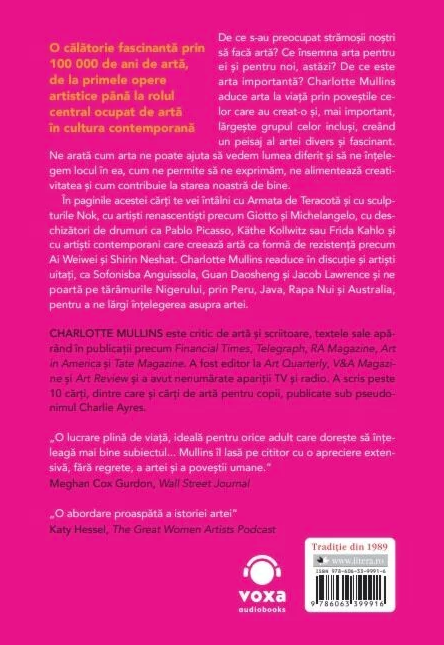 De ce s-au preocupat strămoșii noștri să facă artă? Ce însemna arta pentru ei și pentru noi, astăzi? De ce este arta importantă? Charlotte Mullins aduce arta la viață prin poveștile celor care au creat-o și, mai important, lărgește grupul celor incluși, creând un peisaj al artei divers și fascinant. Ne arată cum arta ne poate ajuta să vedem lumea diferit și să ne înțelegem locul în ea, cum ne permite să ne exprimăm, ne alimentează creativitatea și cum contribuie la starea noastră de bine.