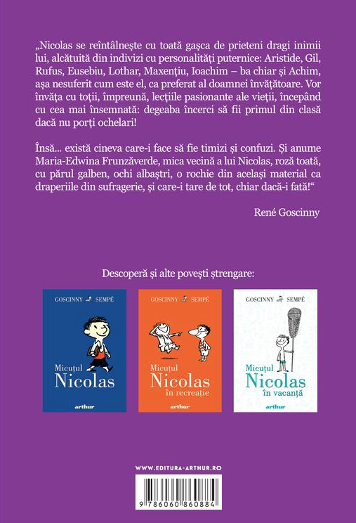Și anume Maria-Edwina Frunzăverde, mica vecină a lui Nicolas, roză toată, cu părul galben, ochi albaștri, o rochie din același material ca draperiile din sufragerie, și care-i tare de tot, chiar dacă-i fată!”