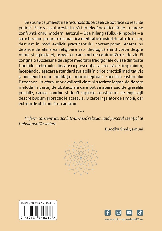Se spune că „maeștrii se recunosc după ceea ce pot face cu resurse puține”. Este și cazul acestei lucrări. Înțelegând dificultățile cu care se confruntă omul modern, autorul – Dza Kilung (Tulku) Rinpoche – a structurat un program de practică meditativă având durata de un an, destinat în mod explicit practicantului contemporan. Acesta nu depinde de alinierea religioasă sau ideologică (fiind vorba despre minte și agitația ei, aspect cu care toți ne confruntăm zi de zi). El conține o succesiune de șapte meditații tradiționale culese din toate tradițiile budismului, fiecare cu prescripția sa precisă de timp minim, începând cu așezarea standard (valabilă în orice practică meditativă) și încheind cu o meditație nonconceptuală specifică sistemului Dzogchen. În afara unor explicații clare și succinte legate de fiecare metodă în parte, de obstacolele care pot să apară sau de greșelile posibile, cartea conține și două capitole consistente de explicații despre budism și practicile acestuia. O carte înșelător de simplă, dar extrem de utilă oricărui căutător.