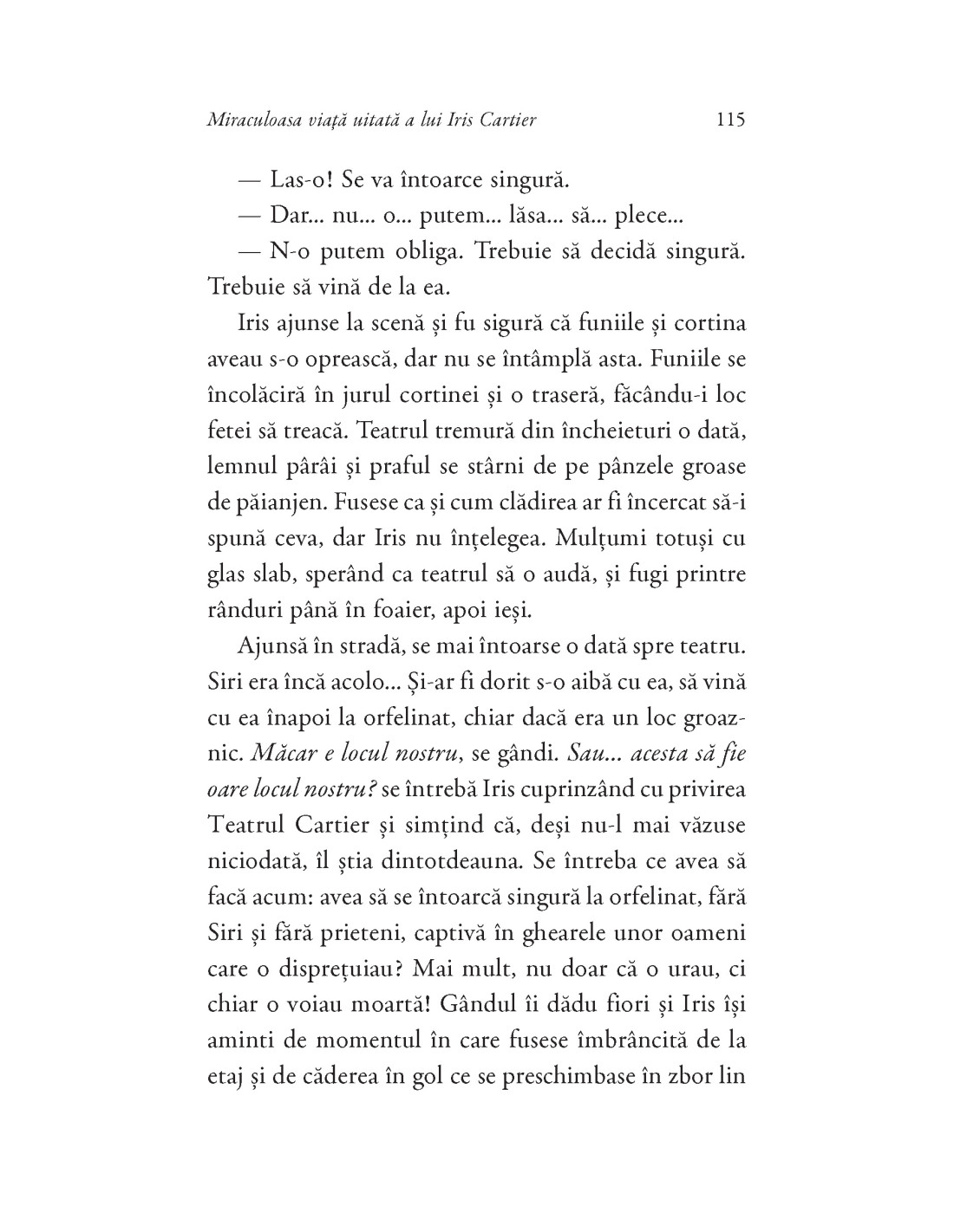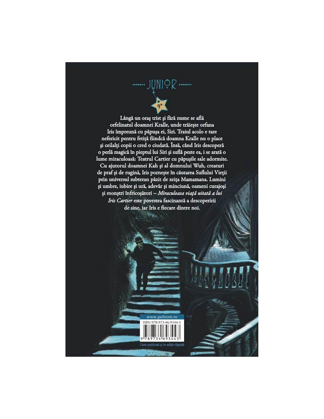 Lângă un oraș trist și fără nume se află orfelinatul doamnei Kralle, unde trăiește orfana Iris împreună cu păpușa ei, Siri. Traiul acolo e tare nefericit pentru fetiţă fiindcă doamna Kralle nu o place și ceilalţi copii o cred o ciudată. Însă, când Iris descoperă o perlă magică în pieptul lui Siri și suflă peste ea, i se arată o lume miraculoasă: Teatrul Cartier cu păpușile sale adormite. Cu ajutorul doamnei Kah și al domnului Wuh, creaturi de praf și de rugină, Iris pornește în căutarea Suflului Vieţii prin universul subteran păzit de zeiţa Mamamana. Lumini și umbre, iubire și ură, adevăr și minciună, oameni curajoși și monștri înfricoșători – Miraculoasa viaţă uitată a lui Iris Cartier este povestea fascinantă a descoperirii de sine, iar Iris e fiecare dintre noi.