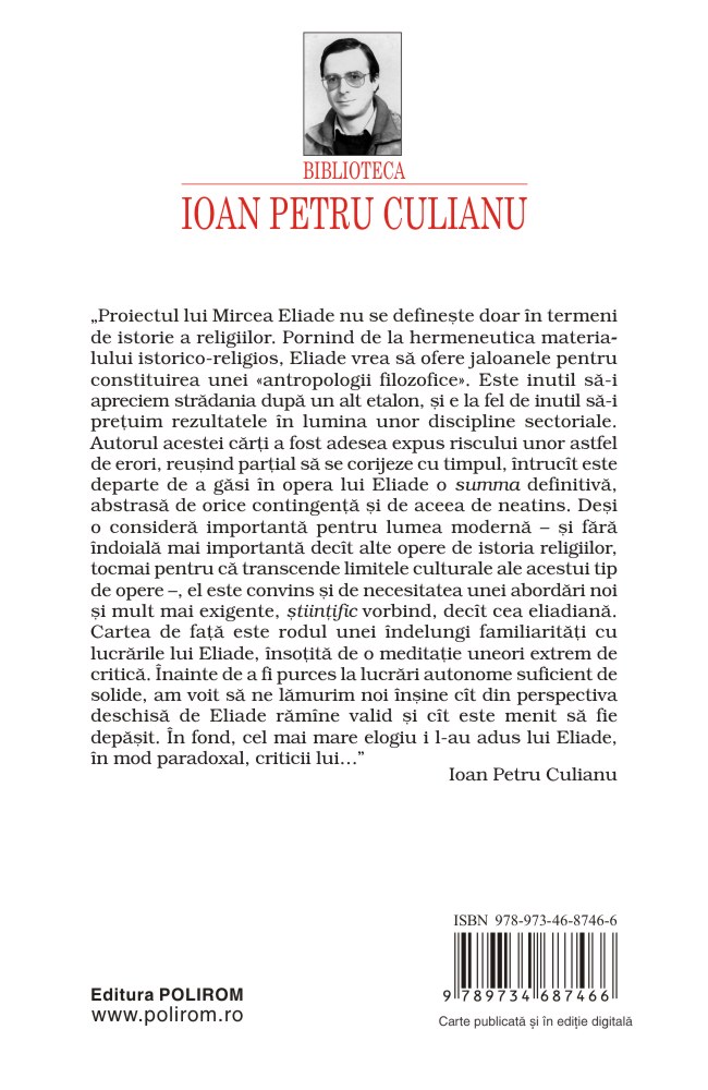 „Proiectul lui Mircea Eliade nu se definește doar în termeni de istorie a religiilor. Pornind de la hermeneutica materialului istorico-religios, Eliade vrea să ofere jaloanele pentru constituirea unei «antropologii filozofice». Este inutil să-i apreciem strădania după un alt etalon, și e la fel de inutil să-i prețuim rezultatele în lumina unor discipline sectoriale. Autorul acestei cărți a fost adesea expus riscului unor astfel de erori, reușind parțial să se corijeze cu timpul, întrucât este departe de a găsi în opera lui Eliade o summa definitivă, abstrasă de orice contingență și de aceea de neatins. Deși o consideră importantă pentru lumea modernă – și fără îndoială mai importantă decât alte opere de istoria religiilor, tocmai pentru că transcende limitele culturale ale acestui tip de opere –, el este convins și de necesitatea unei abordări noi și mult mai exigente, științific vorbind, decât cea eliadiană. Cartea de față este rodul unei îndelungi familiarități cu lucrările lui Eliade, însoțită de o meditație uneori extrem de critică. Înainte de a fi purces la lucrări autonome suficient de solide, am voit să ne lămurim noi înșine cât din perspectiva deschisă de Eliade rămâne valid și cât este menit să fie depășit. În fond, cel mai mare elogiu i l-au adus lui Eliade, în mod paradoxal, criticii lui…” (Ioan Petru Culianu)