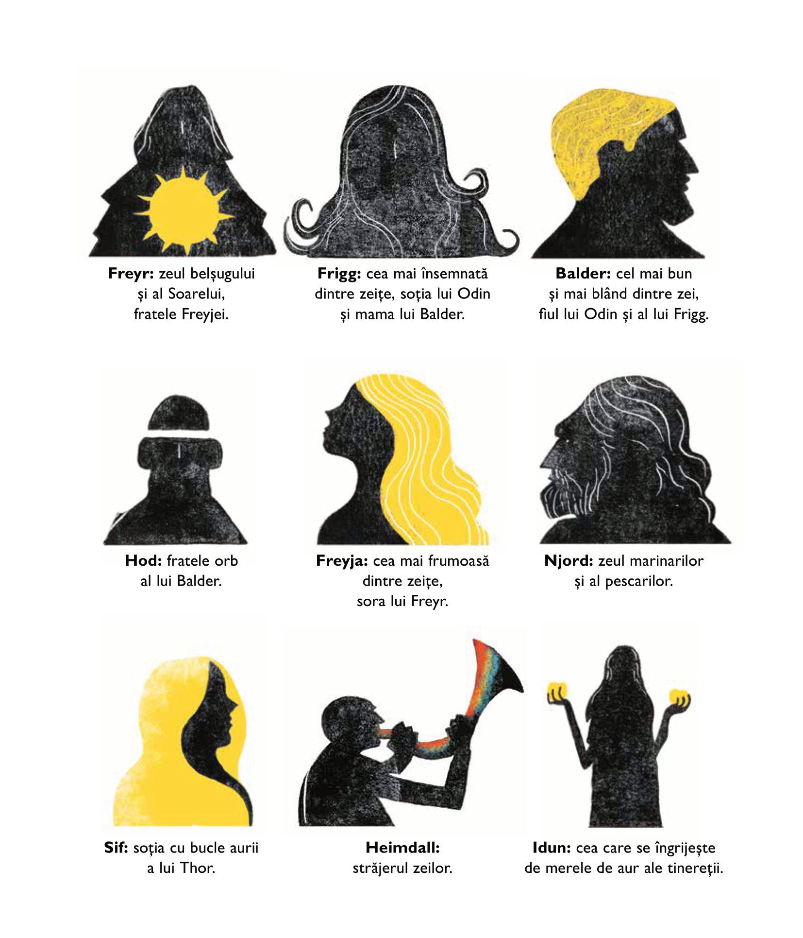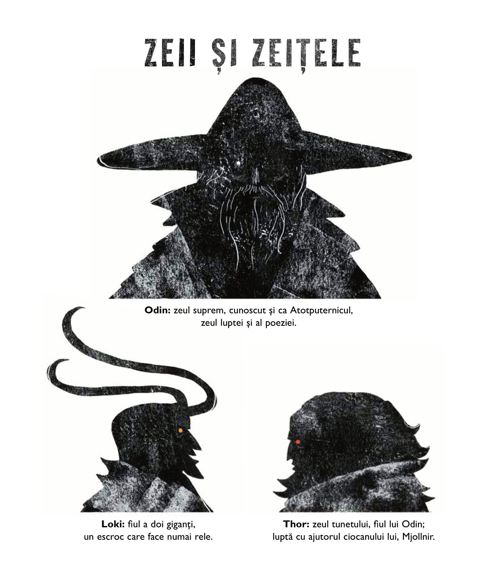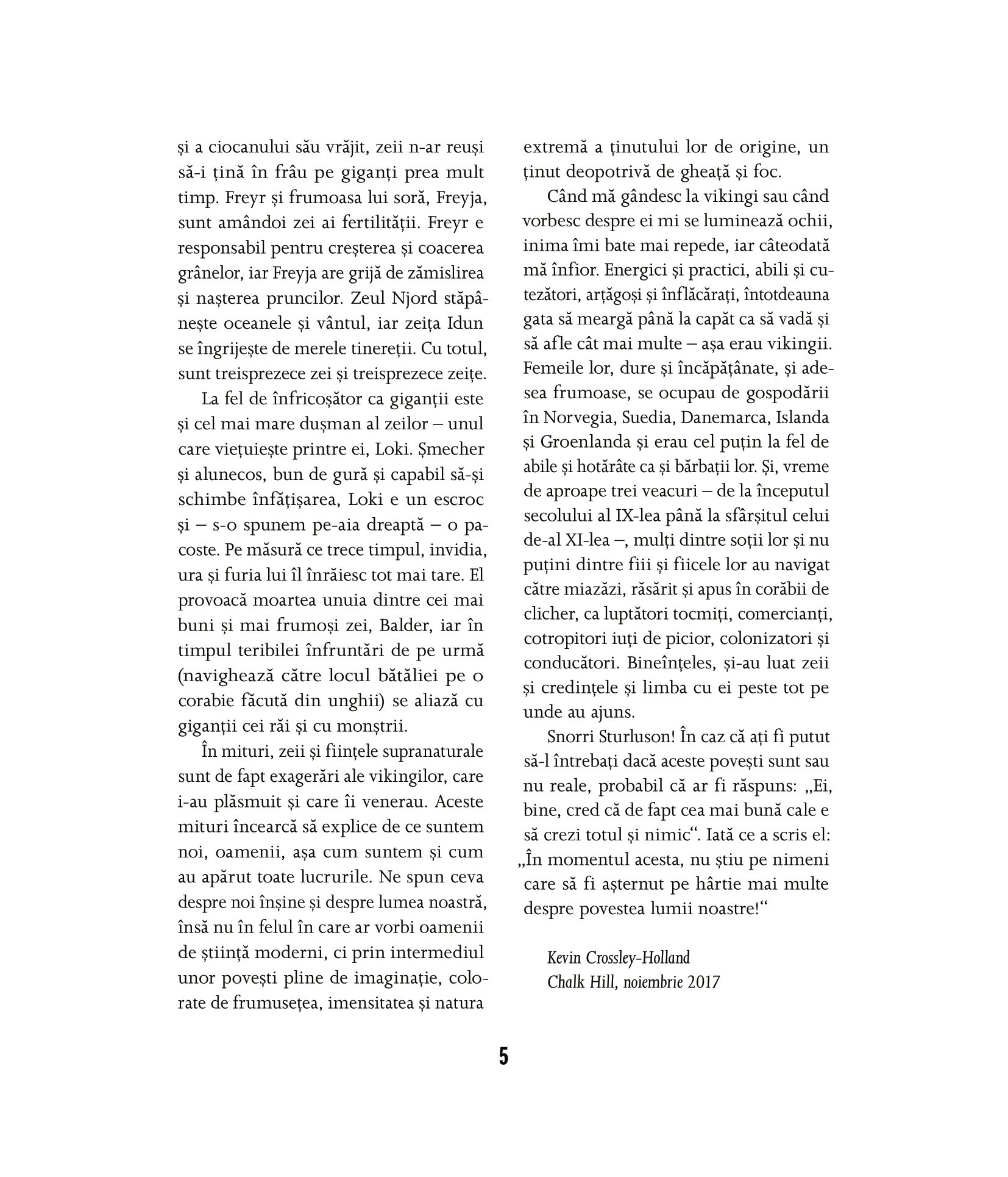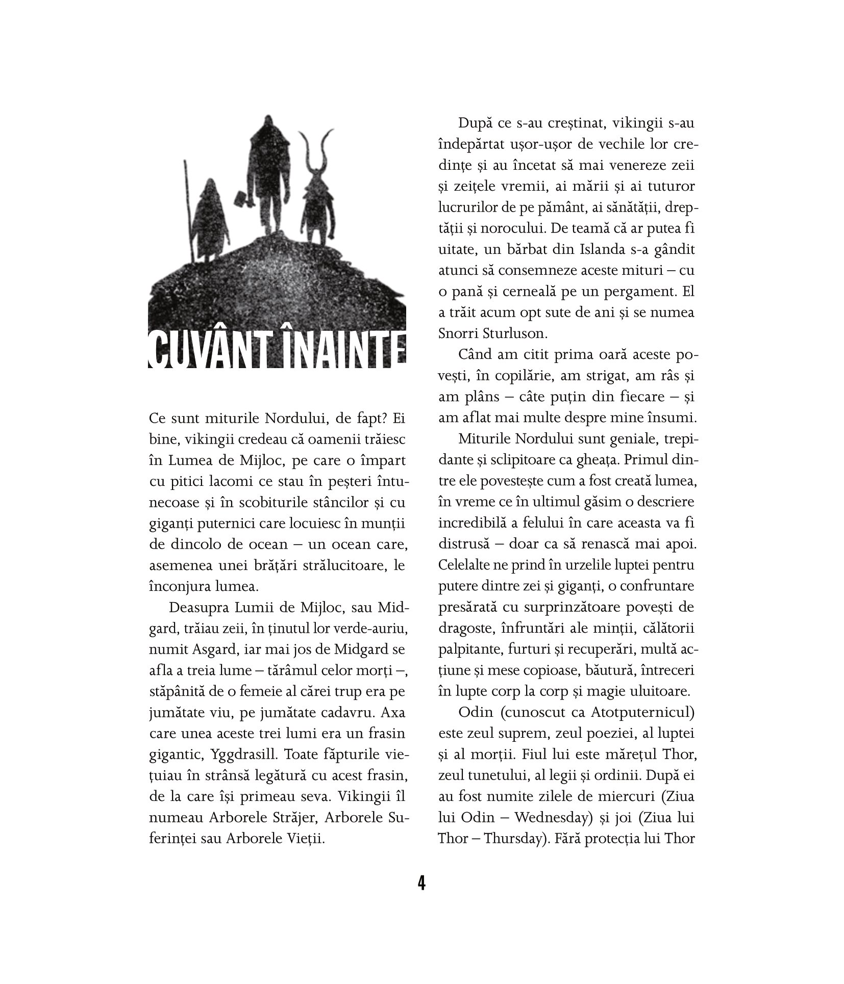 Trepidante și sclipitoare ca gheaţa, miturile vikingilor povestesc cum a fost creată lumea și cum va fi nimicită – pentru ca mai apoi să renască. Zeii, în frunte cu atotputernicul Odin, sunt prinși în vâltoarea unei teribile lupte pentru putere cu înfricoșătorii giganţi, pe care trebuie să-i înfrunte folosindu-se de toată iscusinţa și forţa lor lăuntrică. Însă cel mai de seamă dușman al zeilor se află, de fapt, printre ei. Uneltirile lui ticăloase vor duce la izbucnirea bătăliei de pe urmă, Ragnarok. Aceste mituri străvechi, cu vrăji, călătorii palpitante, povești de dragoste, înfruntări ale minţii și uluitoare încleștări de forţe sunt repovestite cu dramatism și mult talent de Kevin Crossley-Holland și ilustrate magistral de Jeffrey Alan Love.