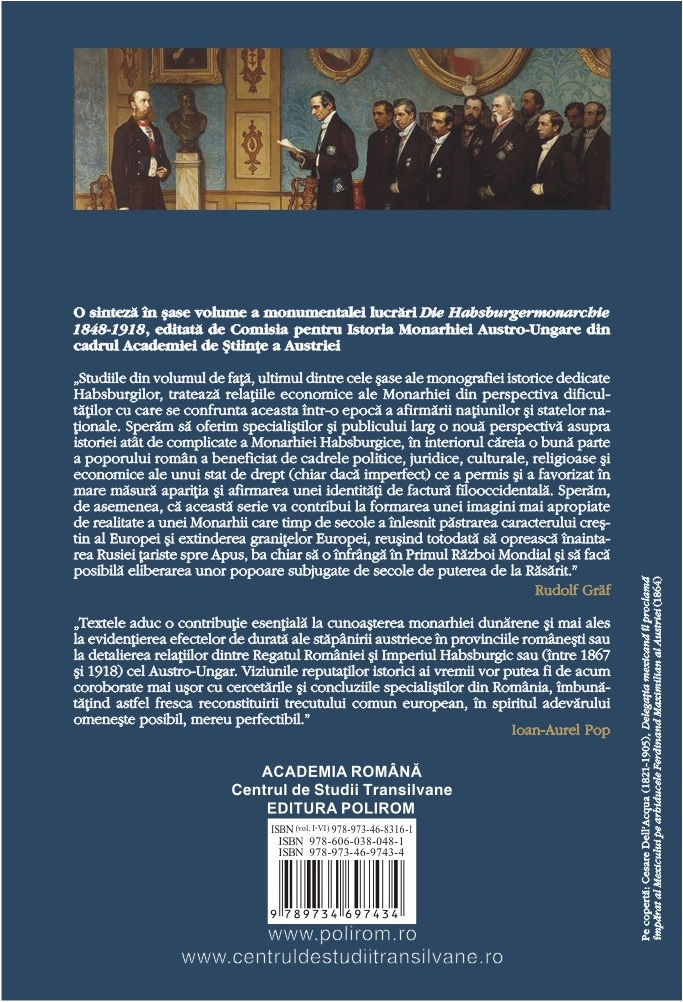 „Studiile din volumul de față, ultimul dintre cele șase ale monografiei istorice dedicate Habsburgilor, tratează relațiile economice ale Monarhiei din perspectiva dificultăților cu care se confrunta aceasta într‑o epocă a afirmării națiunilor și statelor naționale. Sperăm să oferim specialiștilor și publicului larg o nouă perspectivă asupra istoriei atât de complicate a Monarhiei Habsburgice, în interiorul căreia o bună parte a poporului român a beneficiat de cadrele politice, juridice, culturale, religioase și economice ale unui stat de drept (chiar dacă imperfect) ce a permis și a favorizat în mare măsură apariția și afirmarea unei identități de factură filooccidentală. Sperăm, de asemenea, că această serie va contribui la formarea unei imagini mai apropiate de realitate a unei Monarhii care timp de secole a înlesnit păstrarea caracterului creștin al Europei și extinderea granițelor Europei, reușind totodată să oprească înaintarea Rusiei țariste spre Apus, ba chiar să o înfrângă în Primul Război Mondial și să facă posibilă eliberarea unor popoare subjugate de secole de puterea de la Răsărit.” (Rudolf Gräf)