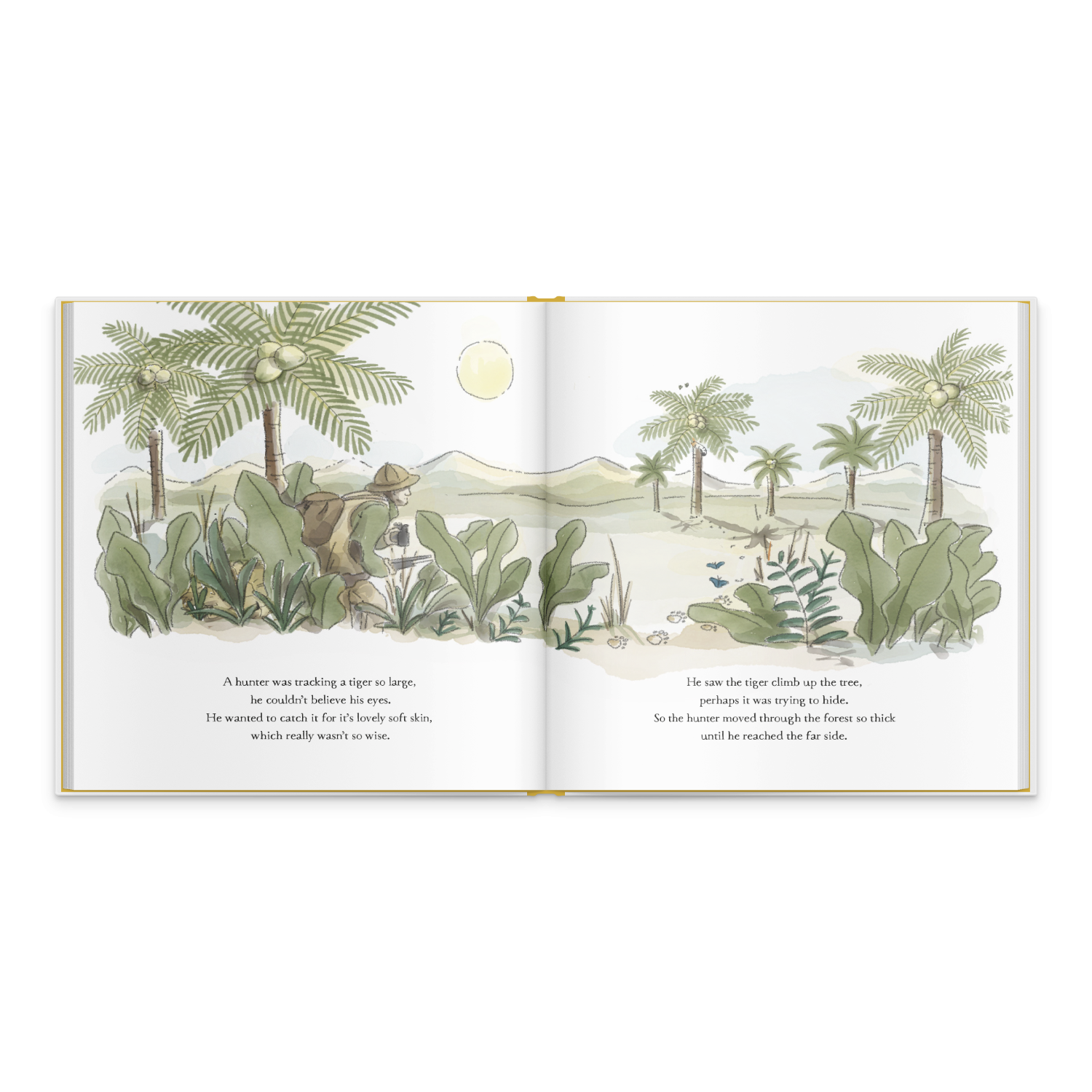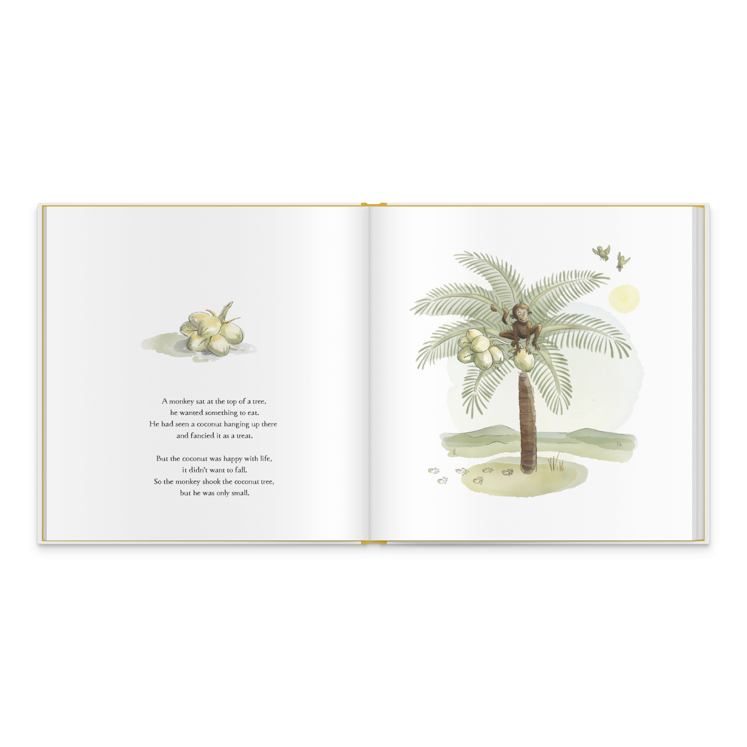 Povestea din Monkey Crush se desfășoară în impresionanta junglă a Indiei, intr-o regiune unde leii și tigrii încă mai există împreună. Cartea aduce în prim plan vânătoarea și permite părinților să le vorbească copiilor despre motivul pentru care oamenii vânează. Este aceasta pentru hrana sau pentru plăcere? Povestea începe cu o nucă de cocos, care prinde viață și arată cum un prânz neașteptat poate salva animalele de a fi mâncate sau vânate. Autorul recomandă ca aceasta carte să fie citită personificând personajele, făcând fețe amuzante și imitând diferite voci, lucru ce îi va ajuta pe copii să se simtă conectați la carte, iar experiența educațională să fie mai amuzantă și mai memorabilă.