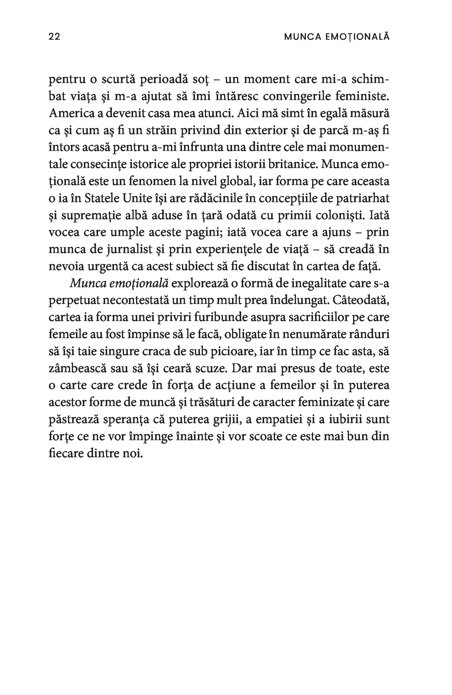 O bonă, o infirmieră, până și câștigătoarea unui concurs de frumusețe sunt toate nevoite să depună muncă emoțională. Chiar și într-un context profesional, obligația de a-i servi pe ceilalți impune adoptarea ipostazei epuizante de mamă, sau de soră împăciuitoare, sau de divă sexy și limitează drastic posibila exprimare a sinelui autentic. Paradoxul muncii emoționale este că percepția asupra capacităților femeilor este profund devalorizantă, ceea ce susține în continuare patriarhatul și duce la desconsiderarea muncii prestate de acestea.