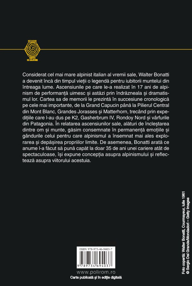 Considerat cel mai mare alpinist italian al vremii sale, Walter Bonatti a devenit încă din timpul vieții o legendă pentru iubitorii muntelui din întreaga lume. Ascensiunile pe care le-a realizat în 17 ani de alpinism de performanță uimesc și astăzi prin îndrăzneala și dramatismul lor. Cartea sa de memorii le prezintă în succesiune cronologică pe cele mai importante, de la Grand Capucin până la Pilierul Central din Mont Blanc, Grandes Jorasses și Matterhorn, trecând prin expedițiile care l-au dus pe K2, Gasherbrum IV, Rondoy Nord și vârfurile din Patagonia. În relatarea ascensiunilor sale, alături de încleștarea dintre om și munte, găsim consemnate în permanență emoțiile și gândurile celui pentru care alpinismul a însemnat mai ales explorarea și depășirea propriilor limite. De asemenea, Bonatti arată ce anume l-a făcut să pună capăt la doar 35 de ani unei cariere atât de spectaculoase, își expune concepția asupra alpinismului și reflectează asupra viitorului acestuia.