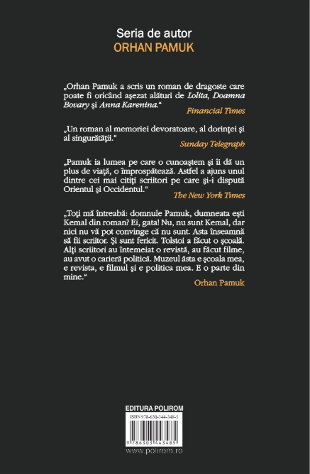 „Orhan Pamuk a scris un roman de dragoste care poate fi oricând așezat alături de Lolita, Doamna Bovary și Anna Karenina.” (Financial Times)