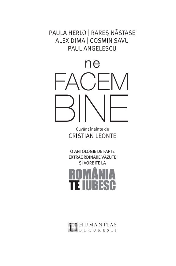 Oamenii care fac binele sunt eroii acestei cărți. Oameni care s-au ridicat deasupra propriei condiții, unii deasupra vremurilor, și și-au dus tot mai sus visul, familia, comunitatea. Ei și ele au harul de a-i ajuta pe alții – în suferință sau în nevoie –, au darul și norocul să devină lideri în munca lor. Ei și ele sunt dovezi că se poate, că voința și munca aduc rezultate, împlinire și chiar fericirea, după 30 de ani în care prea mulți români au fost alungați din țară de lipsa oportunităților oneste, de incompetenți sau ticăloși instalați peste noapte în posturi de decizie, de proiecte veșnic neîncepute vândute ca promisiuni ferme. Volumul acesta le este închinat oamenilor care împing lucrurile înainte în jurul lor, celor care luptă să schimbe lucruri ce se încăpățânează să rămână neschimbate.