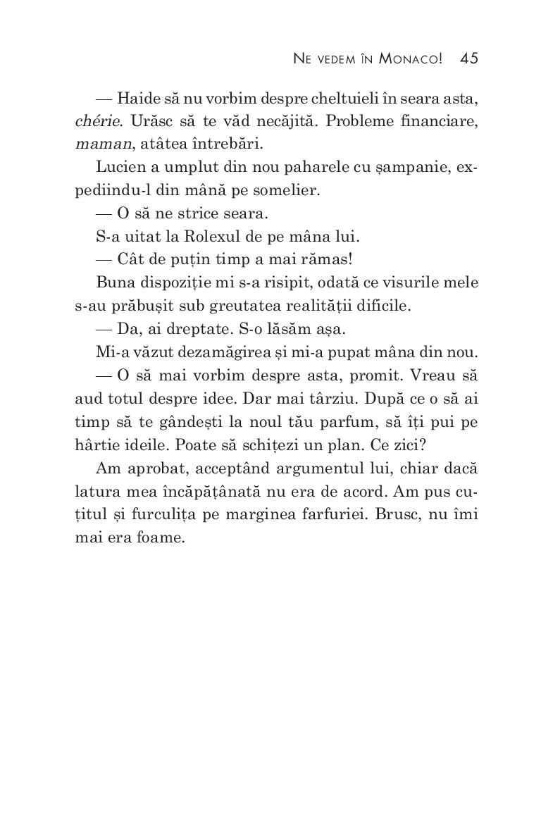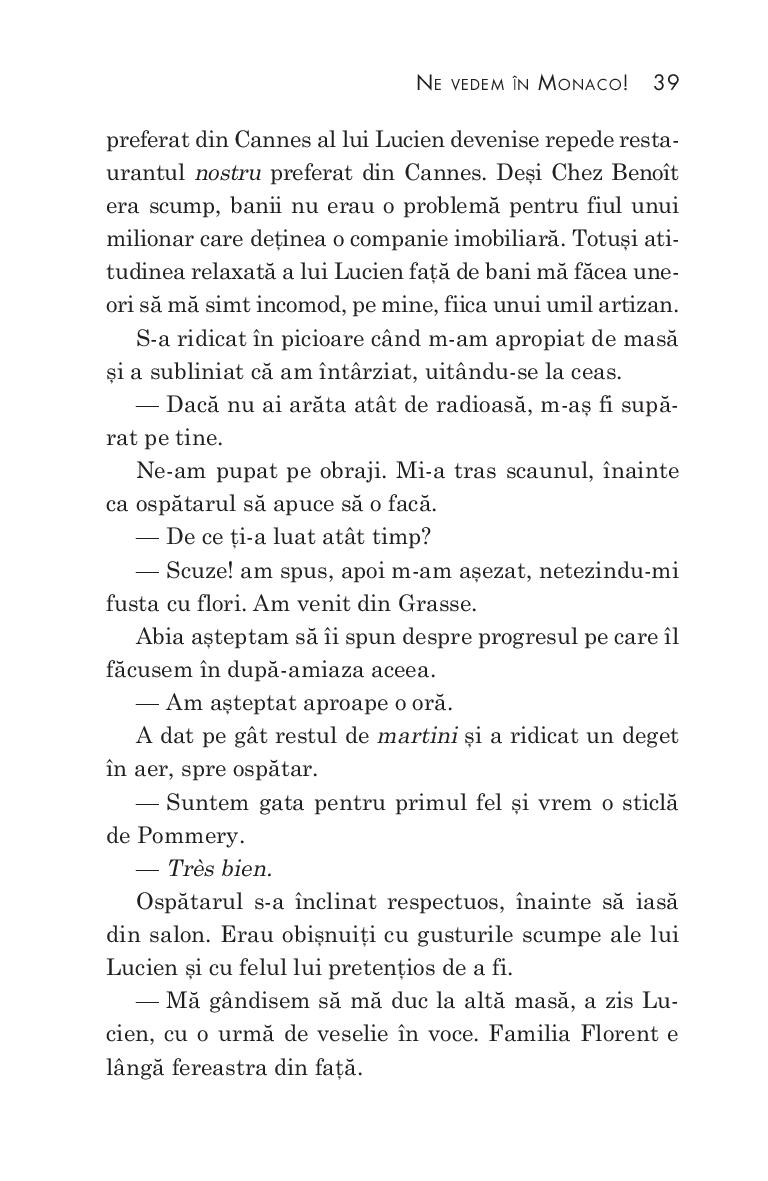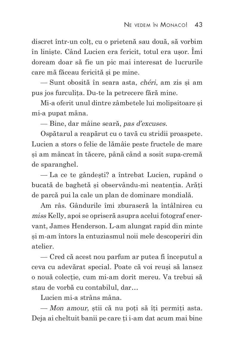 Având drept decor povestea de dragoste surprinzătoare și nunta legendară din anii 1950 a actriței Grace Kelly cu prințul Rainier de Monaco, romanul autoarelor de bestselleruri Hazel Gaynor și Heather Webb își poartă cititorii într-o aventură strălucitoare, scăldată de soare, pe Coasta de Azur. Ne vedem în Monaco! este un roman încântător și pasional despre puterea destinului. Starurile de cinema și paparazzii sosiți la Cannes pentru festivalul de film fac orășelul să pară neîncăpător, însă Grace Kelly, cea mai urmărită personalitate, caută doar să se ascundă de blițuri. Atunci când Sophie Duval, tânără creatoare de parfumuri, o adăpostește în buticul ei pe miss Kelly de un anume reporter britanic deranjant de insistent, pe nume James Henderson, între cele două femei ia naștere o legătură intensă, care va continua de-a lungul a treizeci de ani de prietenie, dragoste și tragedie.