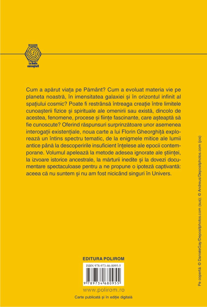 Cum a apărut viața pe Pămînt? Cum a evoluat materia vie pe planeta noastră, în imensitatea galaxiei și în orizontul infinit al spațiului cosmic? Poate fi restrînsă întreaga creație între limitele cunoașterii fizice și spirituale ale omenirii sau există, dincolo de acestea, fenomene, procese și ființe fascinante, care așteaptă să fie cunoscute? Oferind răspunsuri neașteptate acestor întrebări, Noi, Pământenii și Ei, Galacticii explorează un întins spectru tematic, de la enigmele mitice ale lumii antice pînă la descoperirile insuficient înțelese ale lumii contemporane. Florin Gheorghiță apelează la metode ale științei adesea ignorate, la mărturii inedite și la dovezi documentare spectaculoase pentru a ne propune o ipoteză captivantă: aceea că nu suntem și nu am fost niciodată singuri în Univers.