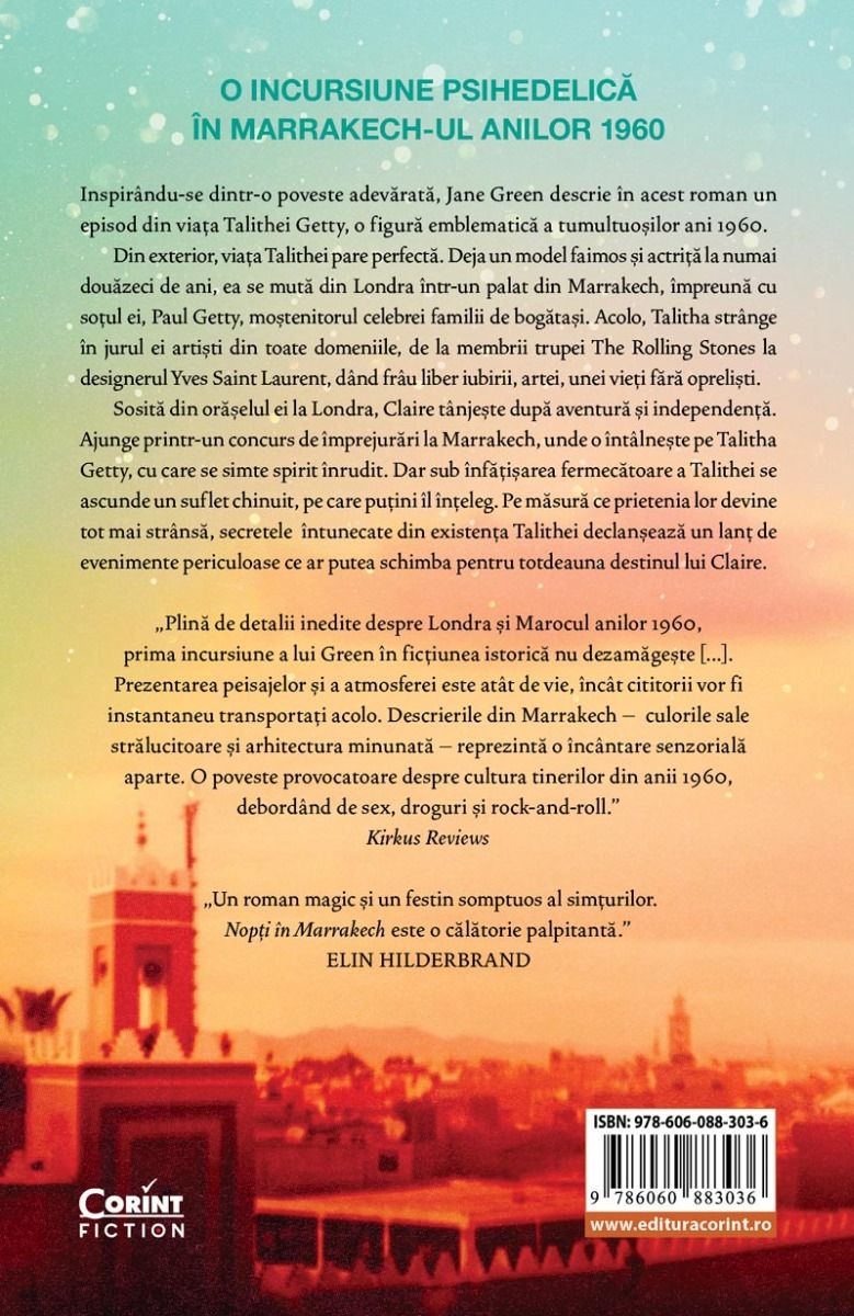 „Nopți în Marrakech se desfășoară ca o călătorie nebună cu trenul Marrakech Express. Bazată pe o poveste adevărată, lumea amețitoare și decadentă a mondenei Talitha Getty din anii 1960 prinde viață într-o țesătură perfectă când o întâlnește pe sora ei de suflet, Claire. Ne aflăm în mâinile maestrei Jane Green, care pictează lumea cu o pensulă vie, picurând stil și emoție. O lectură spectaculoasă, de neuitat.” Adriana Trigiani