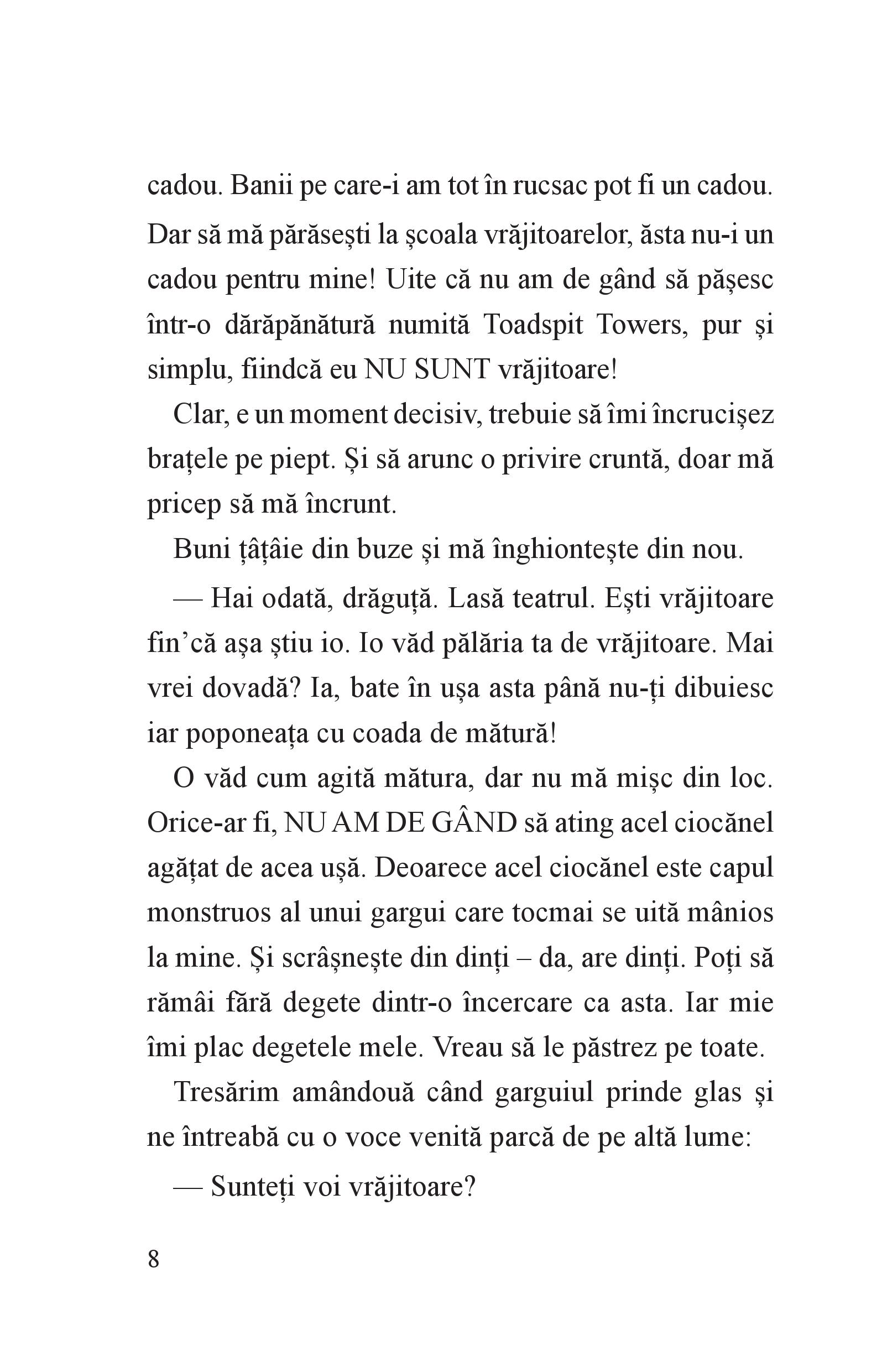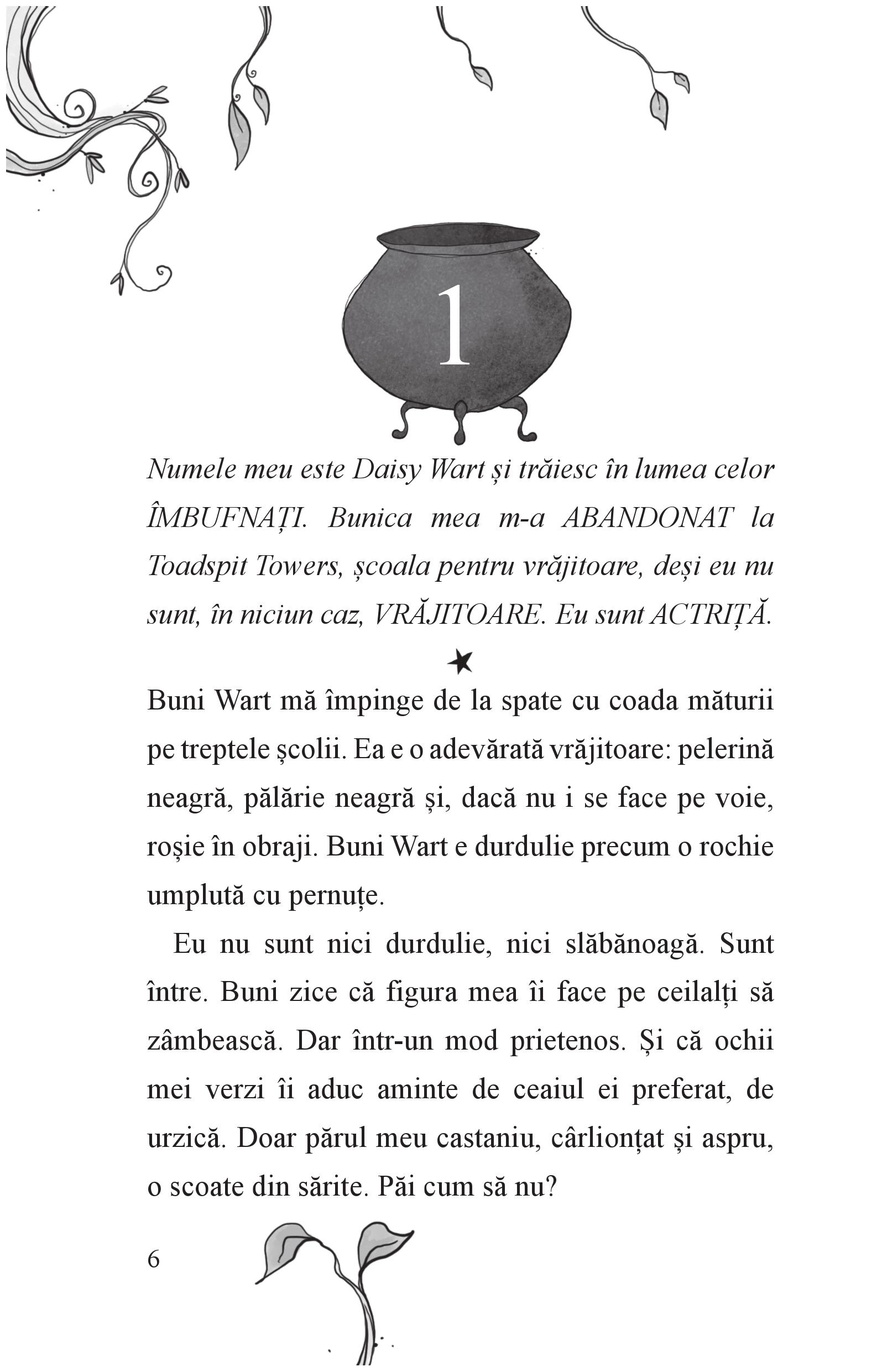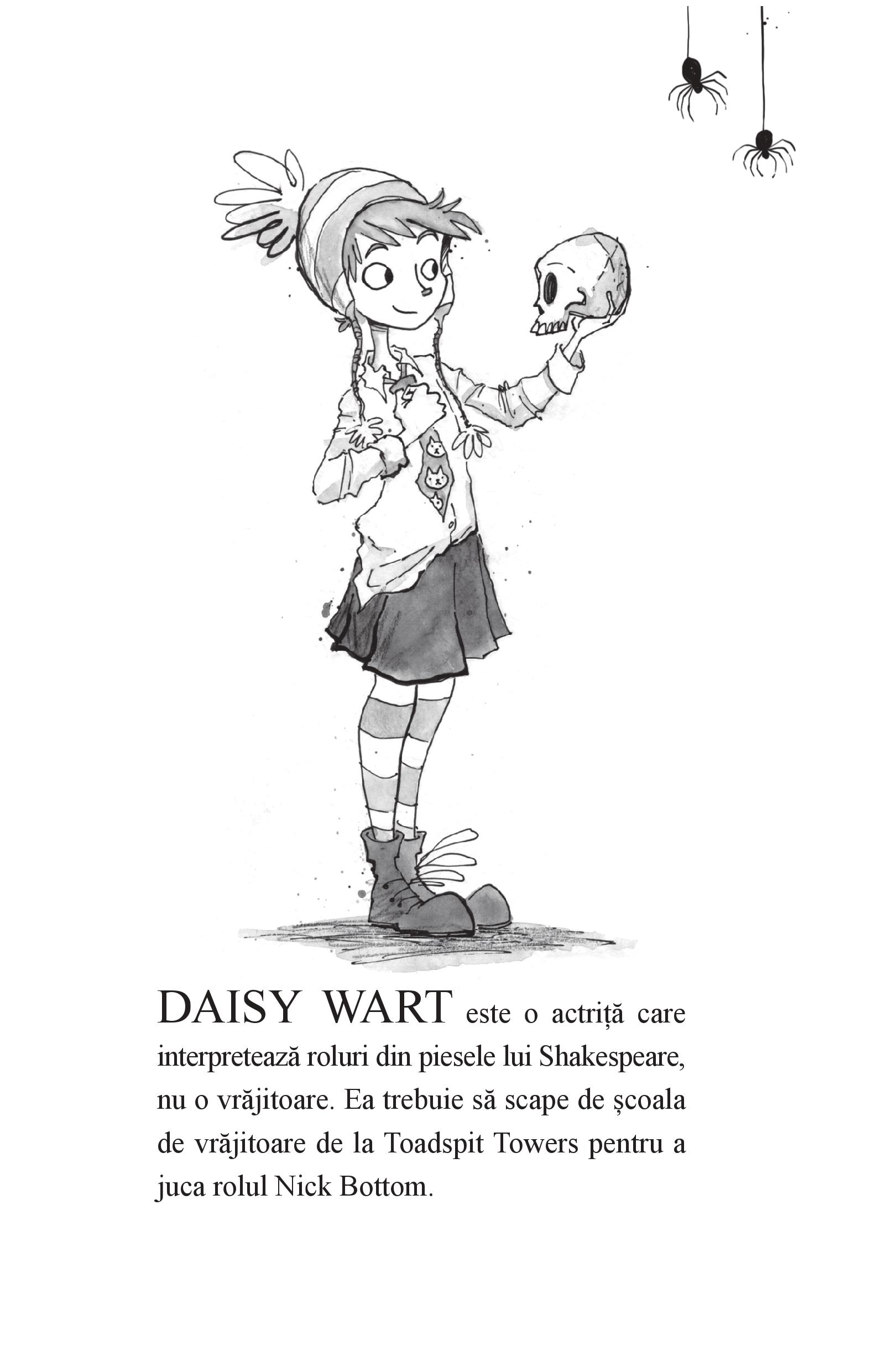 Daisy Wart nu-i vrăjitoare! E actriță, iar actrițele nu au ce căuta la școala pentru vrăjitoare! Dar când se trezește la școala a domnișoarei Toadspit, obligată să doarmă într-un ceaun (ce-i drept, destul de confortabil) și să mănânce terci grețos (ca pedeapsă pentru vrăjile nereușite), jură să scape de acolo cu orice preț. Ca să evadeze de acolo, trebuie să treacă de Spaimele care bântuie coridoarele școlii noaptea. Va reuși Daisy Wart să scape? Și dacă da, nu se va dovedi că totuși... e vrăjitoare? Chiar cea mai teribilă dintre toate...