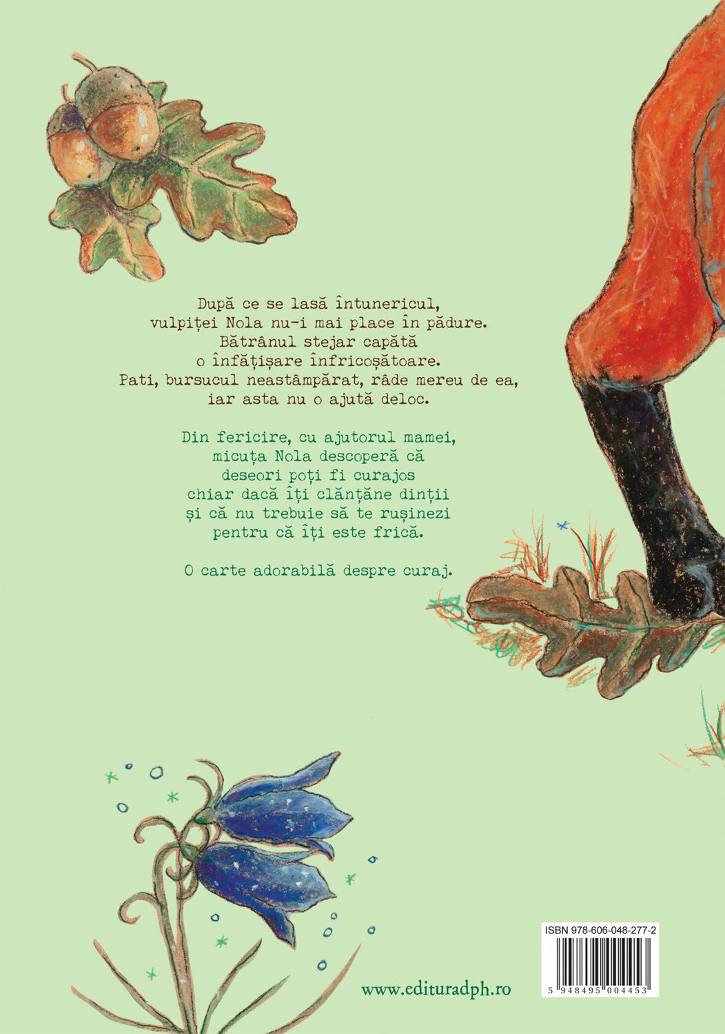 Vulpitei Nola nu ii mai place sa intre in padure in intuneric deoarece stejarul batran capata o infatisare infricosatoare noaptea. Faptul ca prietenul sau, bursucul Pati, rade de ea nu face decat sa inrautateasca lucrurile. Din fericire, cu ajutorul mamei, Nola isi da seama ca nu trebuie sa se rusineze atunci cand ii este frica, iar clantanitul dintilor si curajul sunt lucruri foarte apropiate.