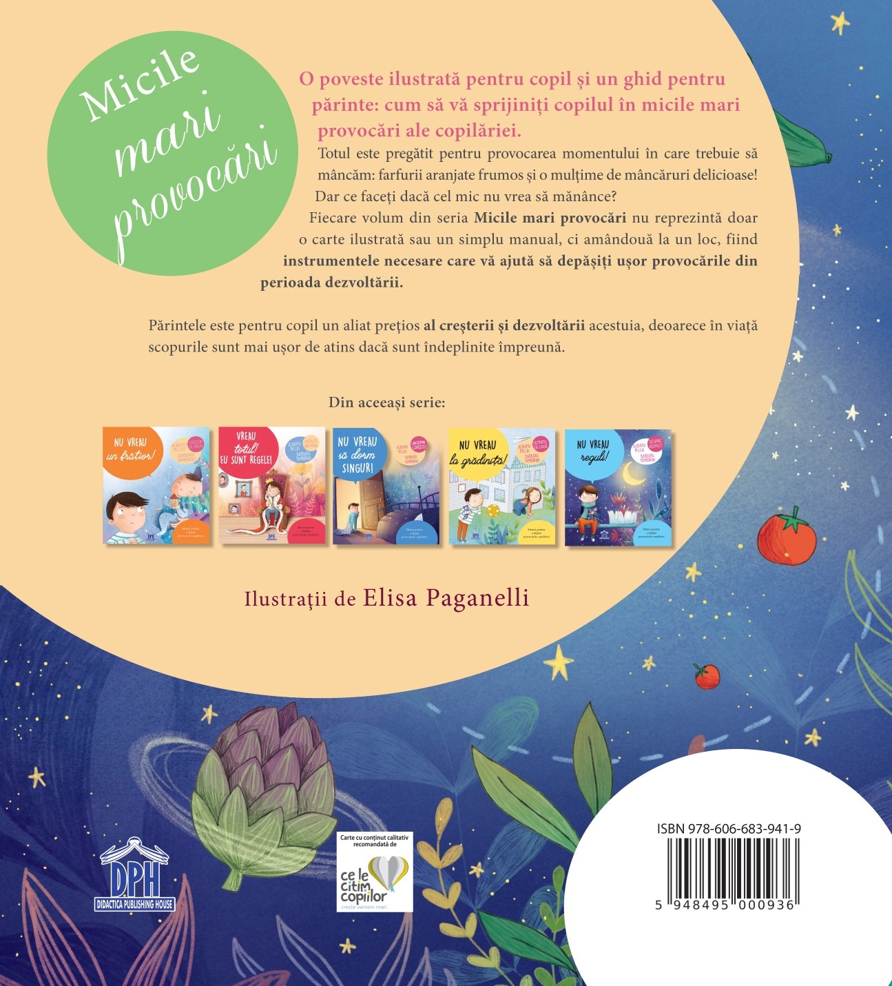 Totul este pregătit pentru provocarea momentului în care trebuie să mâncăm: farfurii aranjate frumos și o mulțime de mâncăruri delicioase! Dar ce faceți dacă cel mic nu vrea să mănânce? Fiecare volum din seria Micile mari provocări nu reprezintă doar o carte ilustrată sau un simplu manual, ci amândouă la un loc, fiind instrumentele necesare care vă ajută să depășiți ușor provocările din perioada dezvoltării.
