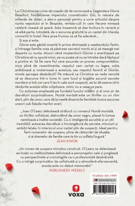 „Joan O’Leary debutează strălucit cu romanul Nuntă mortală, un thriller sofisticat, debordând de umor negru, plasat în lumea nemiloasă a înaltei societăți. Cu o inteligență ascuțită și un stil irezistibil, autoarea dezvăluie o încrengătură de secrete, minciuni și ambiții letale, în interiorul unui castel plin de suspecți. Ideal pentru fanii romanelor de suspans, pline de răsturnări de situație, și ai dramelor de familie care te țin cu sufletul la gură.“ JEAN KWOK