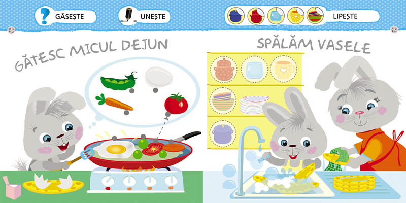 Iepurașul Bunny, personajul celor patru cărți din colecție, îi va ajuta pe copiii de 2 ani să cunoască mai bine realitățile vieții de zi cu zi, în timp ce colorează, lipesc autocolante sau pur și simplu privesc cu atenție imaginile viu colorate! Activitățile incluse le vor îmbogăți și consolida cunoștințele, îi vor face pe copii mai atenți la detalii și vor fi o modalitate bună pentru a-și antrena motorica mâinilor dar și pentru stimularea gândirii logice.