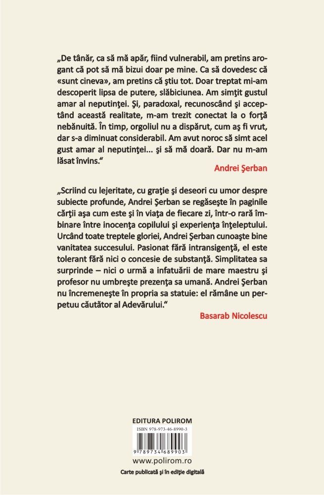 „De tânăr, ca să mă apăr, fiind vulnerabil, am pretins arogant că pot să mă bizui doar pe mine. Ca să dovedesc că «sunt cineva», am pretins că ştiu tot. Doar treptat mi-am descoperit lipsa de putere, slăbiciunea. Am simţit gustul amar al neputinţei. Şi, paradoxal, recunoscând şi acceptând această realitate, m-am trezit conectat la o forţă nebănuită. În timp, orgoliul nu a dispărut, cum aş fi vrut, dar s-a diminuat considerabil. Am avut noroc să simt acel gust amar al neputinţei... şi să mă doară. Dar nu m-am lăsat învins.” (Andrei Şerban)