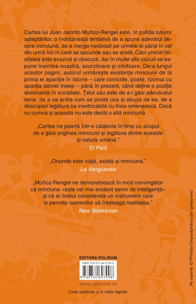 Cartea lui Juan Jacinto Muñoz-Rengel este, în pofida tuturor așteptărilor, o îndrăzneață tentativă de a spune adevărul despre minciună, de a merge neobosit pe urmele ei până în cel din urmă loc în care se ascunde sau se arată. Căci uneori falsitatea este evazivă și obscură, dar în multe alte cazuri se expune înaintea noastră, asurzitoare și orbitoare. De-a lungul acestor pagini, autorul urmărește existența minciunii de la prima ei apariție în istorie – care coincide, poate, tocmai cu apariția istoriei înseși – până în prezent, când deține o poziție dominantă în societate. Țelul său este de a-i găsi adevăratul sens, de a ne arăta cum se poate uza și abuza de ea, de a descoperi legătura sa inextricabilă cu firea omenească. Dacă nu cumva și aceasta nu este decât o altă minciună.