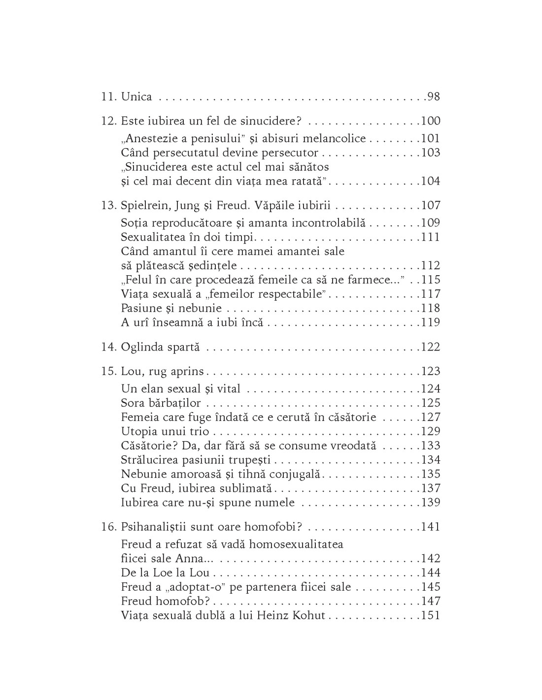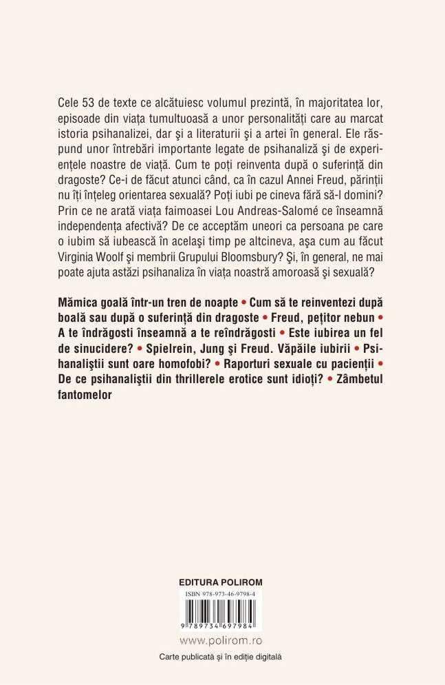 Cele 53 de texte ce alcătuiesc volumul prezintă, în majoritatea lor, episoade din viaţa tumultuoasă a unor personalităţi care au marcat istoria psihanalizei, dar şi a literaturii şi a artei în general. Ele răspund unor întrebări importante legate de psihanaliză şi de experienţele noastre de viaţă. Cum te poţi reinventa după o suferinţă din dragoste? Ce-i de făcut atunci când, ca în cazul Annei Freud, părinţii nu îţi înţeleg orientarea sexuală? Poţi iubi pe cineva fără să-l domini? Prin ce ne arată viaţa faimoasei Lou Andreas-Salomé ce înseamnă independenţa afectivă? De ce acceptăm uneori ca persoana pe care o iubim să iubească în acelaşi timp pe altcineva, aşa cum au făcut Virginia Woolf şi membrii Grupului Bloomsbury? Şi, în general, ne mai poate ajuta astăzi psihanaliza în viaţa noastră amoroasă şi sexuală?