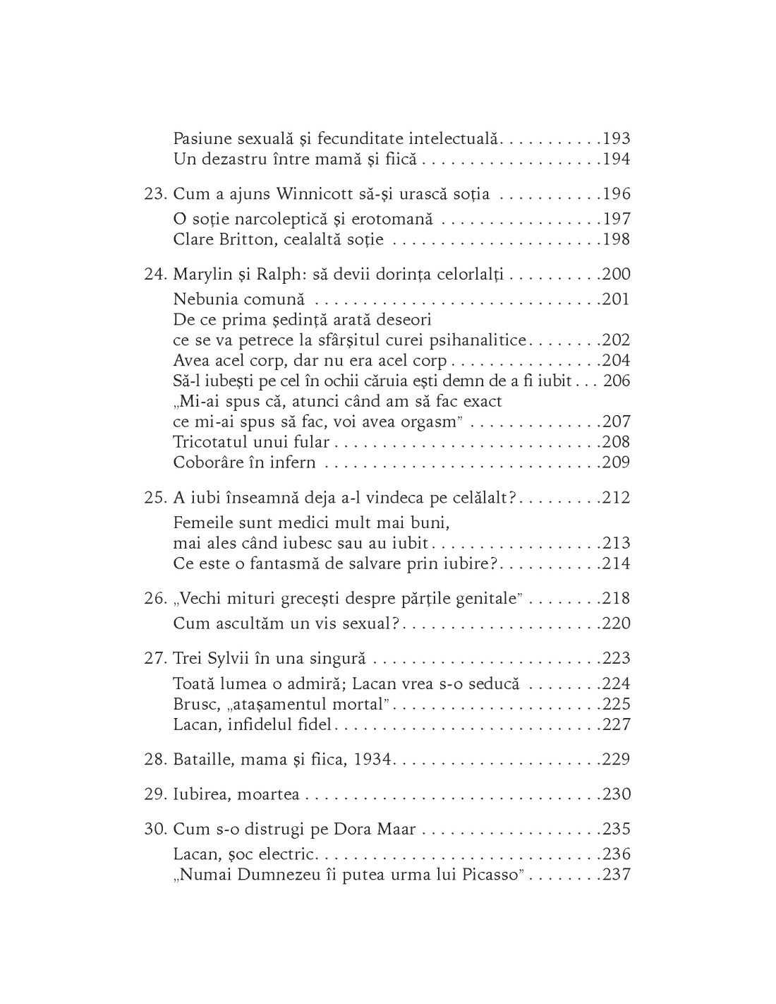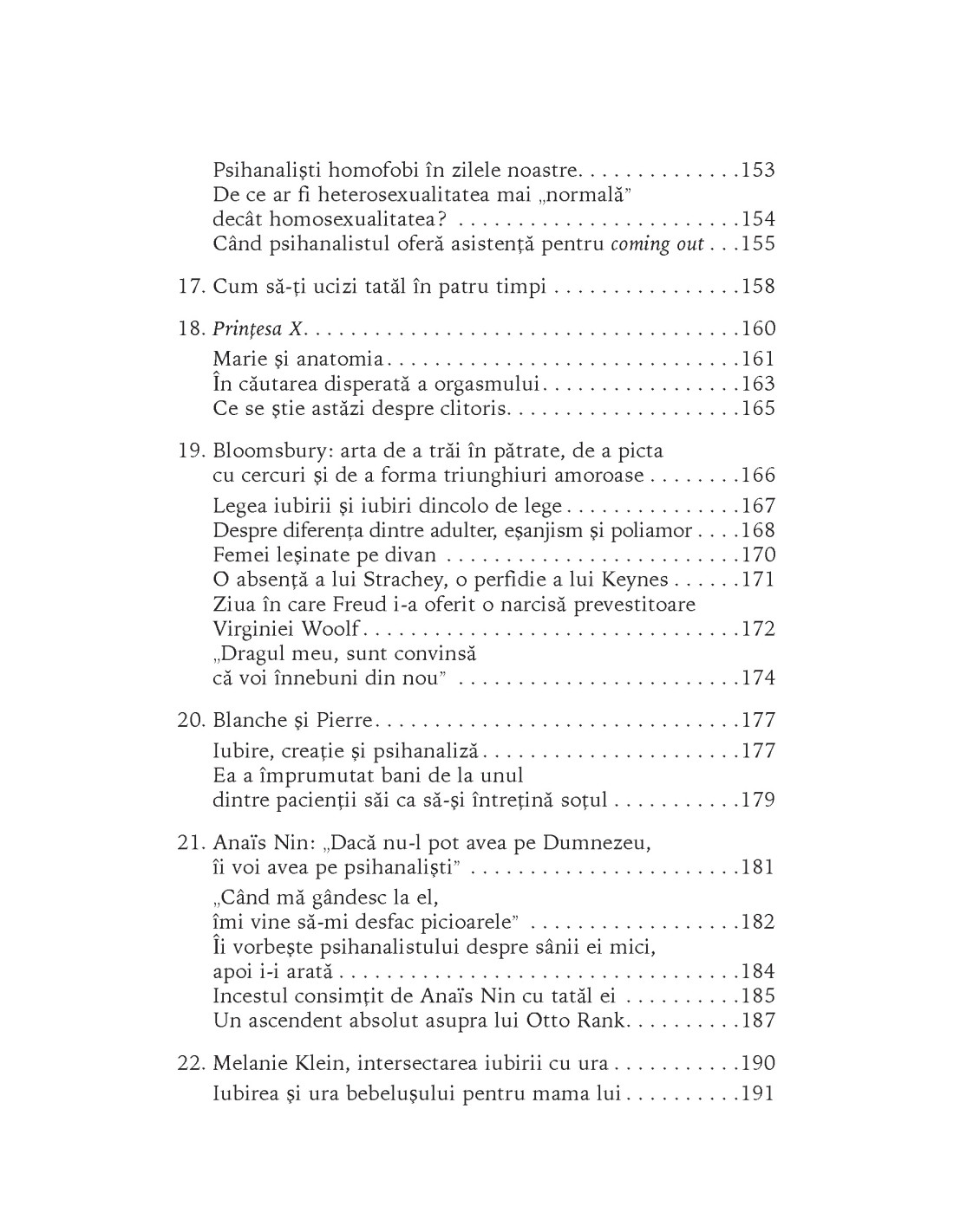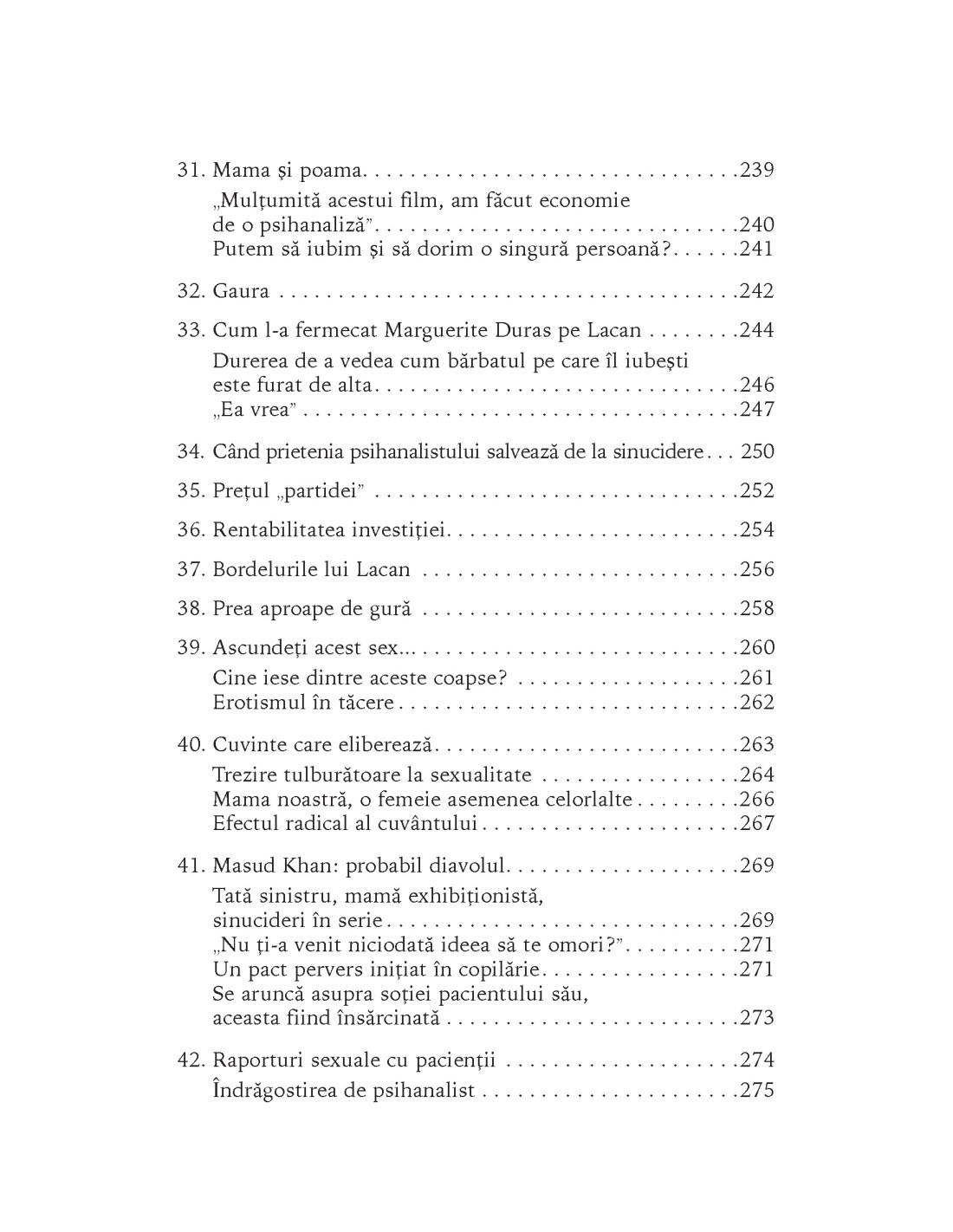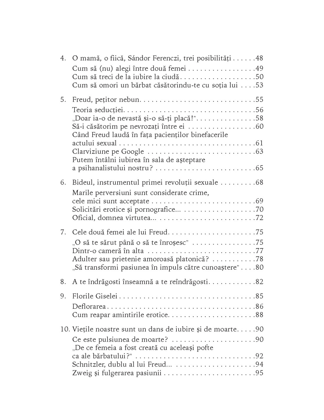 Mămica goală într-un tren de noapte • Cum să te reinventezi după boală sau după o suferinţă din dragoste • Freud, peţitor nebun • A te îndrăgosti înseamnă a te reîndrăgosti • Este iubirea un fel de sinucidere? • Spielrein, Jung şi Freud. Văpăile iubirii • Psihanaliştii sunt oare homofobi? • Raporturi sexuale cu pacienţii • De ce psihanaliştii din thrillerele erotice sunt idioţi? • Zâmbetul fantomelor