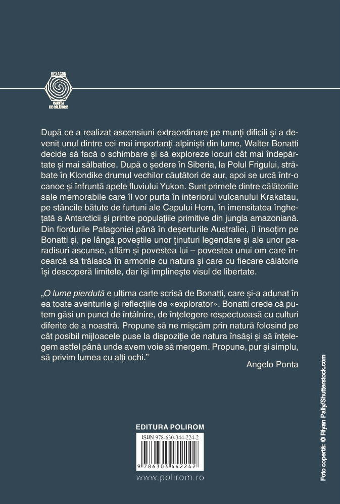 „O lume pierdută e ultima carte scrisă de Bonatti, care şi‑a adunat în ea toate aventurile şi reflecţiile de «explorator». Bonatti crede că putem găsi un punct de întâlnire, de înţelegere respectuoasă cu culturi diferite de a noastră. Propune să ne mişcăm prin natură folosind pe cât posibil mijloacele puse la dispoziţie de natura însăşi şi să înţelegem astfel până unde avem voie să mergem. Propune, pur şi simplu, să privim lumea cu alţi ochi.” (Angelo Ponta)