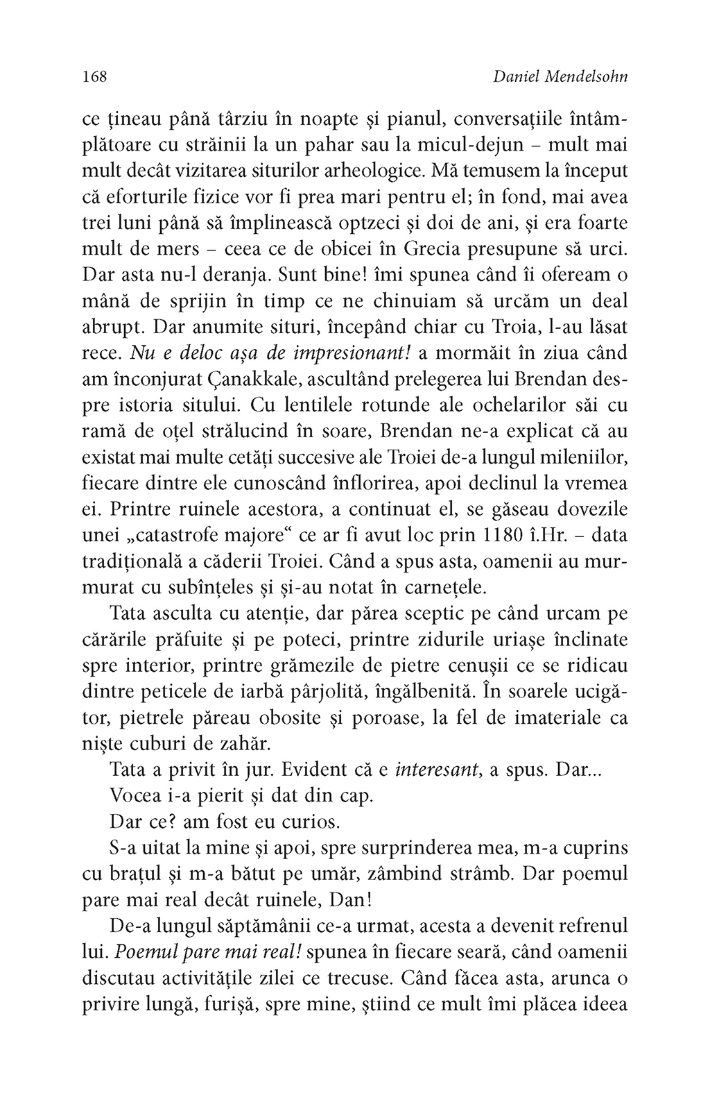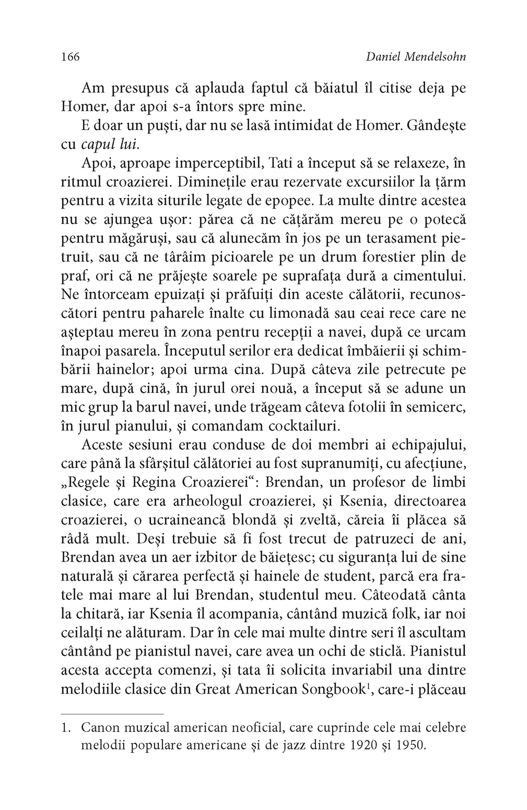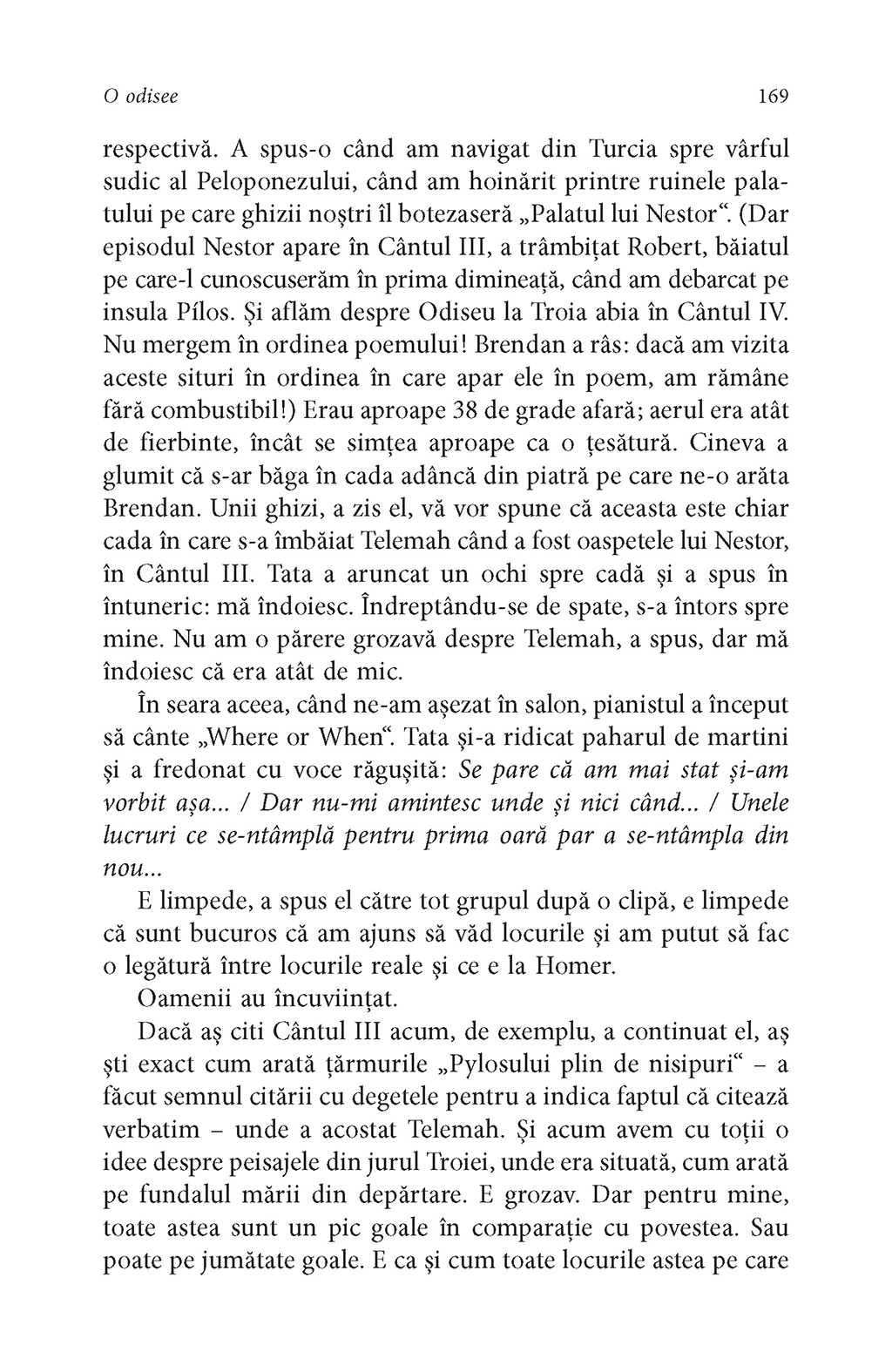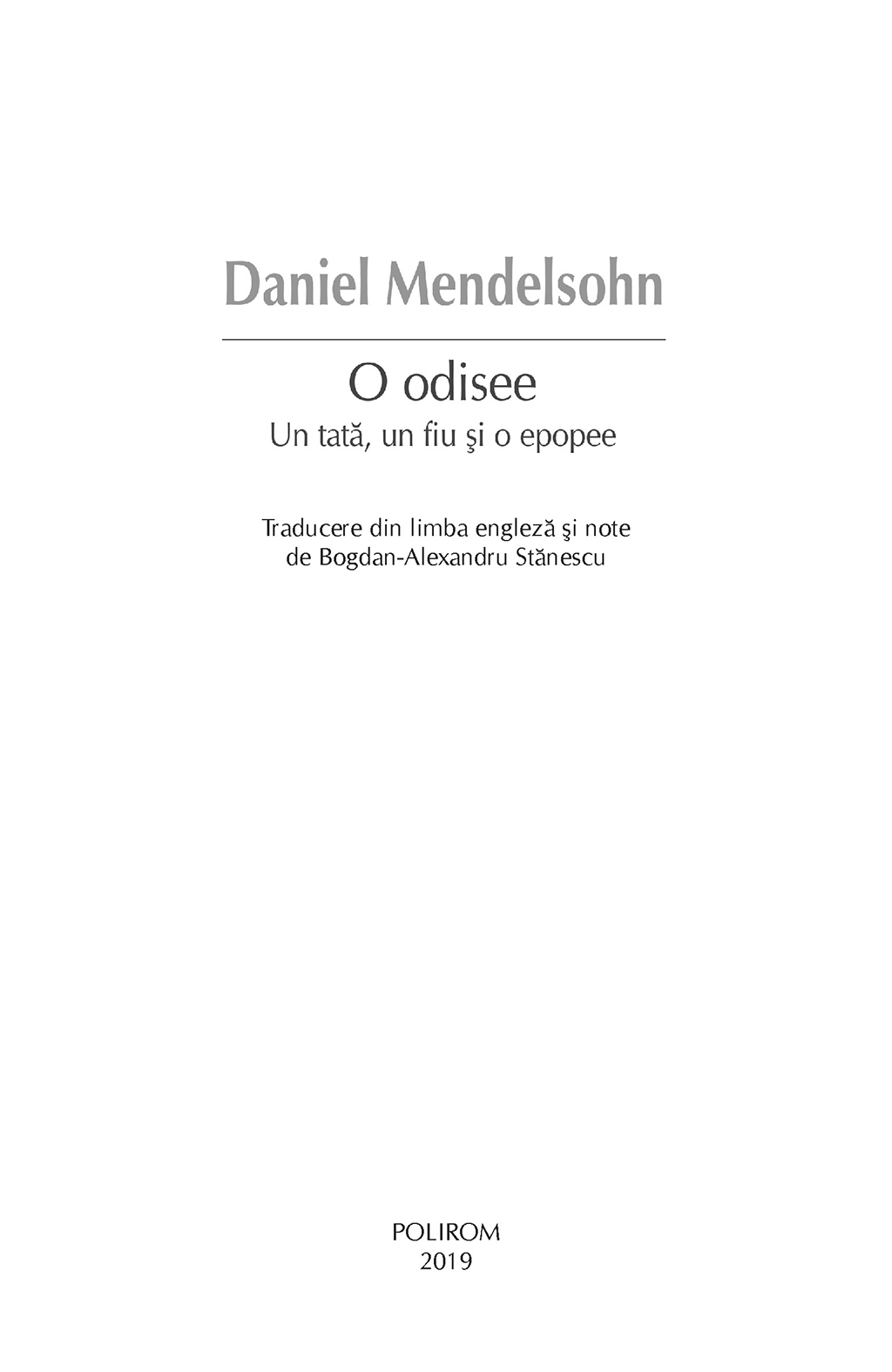 Cînd Jay Mendelsohn, în vîrstă de 81 de ani, se decide să asiste la cursul despre Odiseea lui Homer – ţinut de fiul său –, cei doi, tată şi fiu, pornesc, fără s-o ştie, într-o aventură a cunoaşterii reciproce, înlesnită de lectura textului homeric. Pentru bătrînul Mendelsohn, fost cibernetician, cursul despre Odiseea pare a fi ultima şansă de a relua studiul clasicilor, pe care-l abandonase în liceu, în favoarea matematicii, dar şi de a-şi înţelege fiul, scriitor şi clasicist. Pentru Daniel, înfruntarea săptămînală cu tatăl care îi pune la îndoială interpretările se dovedeşte iarăşi a fi o ultimă şansă: aceea de a pătrunde secretele unui tată de multe ori dificil, aspru şi necomunicativ. Atunci cînd cei doi se îmbarcă într-o croazieră mediteraneeană ce reface traseul lui Odiseu, Daniel realizează că încă are enorm de învăţat de la bătrînul său tată. O carte-hibrid, O odisee explorează domeniul fragil al relaţiei tată-fiu, dar şi tragedia bătrîneţii, a imposibilităţii de a-ţi cunoaşte cu adevărat părinţii.