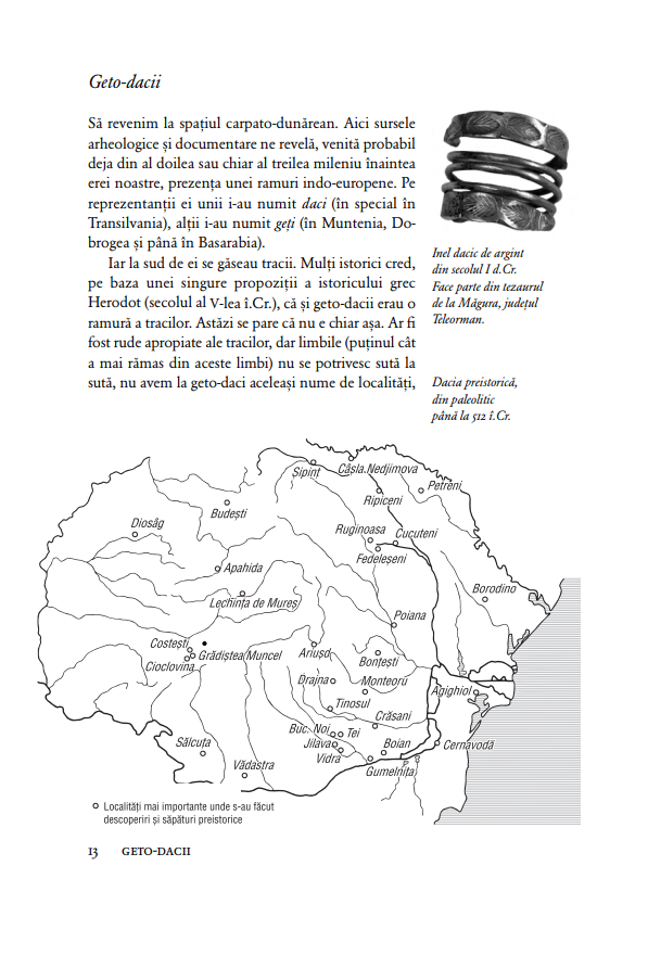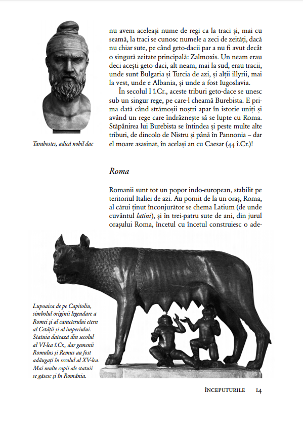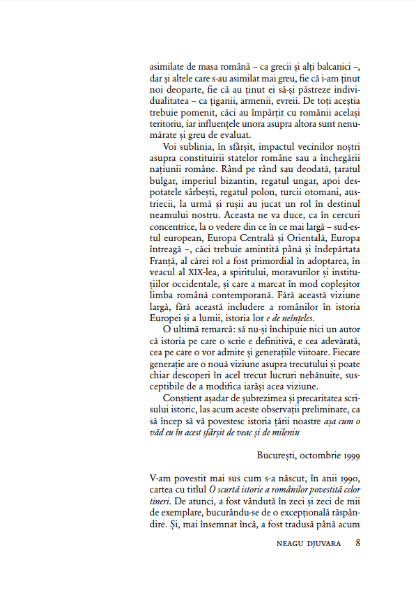 Când este însoţită de ilustraţii, o carte de istorie e mai bună, iar materia sa e şi mai lesne de înţeles şi de reţinut. Imaginile spun ele însele o poveste sau o completează, iar impactul lor e mai puternic decât orice demonstraţie. Documentele iconografice din această ediţie au fost selectate astfel încât cititorul, purtat de farmecul inconfundabil al lui Neagu Djuvara, să şi-i apropie, ca şi cum ar privi într-un album de familie alcătuit de mai multe generaţii, pe oamenii din trecut: împăraţii romani, domnii şi regii români, cu aliaţii şi duşmanii lor, politicienii, buni şi răi, cum i-am avut, în momente de triumf sau de mare restrişte, şi uneori chiar oamenii e rând, pe care istoriile adesea îi uită. Împreună, textul şi imaginile alcătuiesc o minunată istorie ilustrată a românilor.