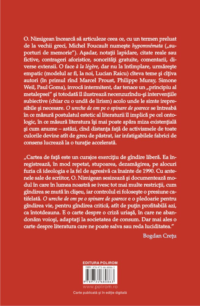 Nimigean încearcă să articuleze ceea ce, cu un termen preluat de la vechii greci, Michel Foucault numeşte hypomnémata („suporturi de memorie”). Aşadar, notaţii lapidare, citate reale sau fictive, contrageri aforistice, sonorităţi gratuite, comentarii, diverse extensii. O face à la légère, dar nu la întîmplare, urmăreşte empatic (modelul ar fi, la noi, Lucian Raicu) cîteva teme şi cîţiva autori (în primul rînd Marcel Proust, Philippe Muray, Simone Weil, Paul Goma), invocă intermitent, dar tenace un „principiu al metalepsei” şi totodată îl ilustrează necenzurîndu-şi intervenţiile subiective (chiar cu o undă de lirism) acolo unde le simte irepresibile şi necesare. O ureche de om pe o spinare de şoarece se întreabă în ce măsură postulatul estetic al literaturii îl implică pe cel ontologic, în ce măsură literatura îşi mai poate apăra miza existenţială şi cum anume – astăzi, cînd distanţa faţă de activismele de toate culorile devine atît de greu de păstrat, iar infatigabilele fabrici de consens lucrează la o turaţie accelerată.