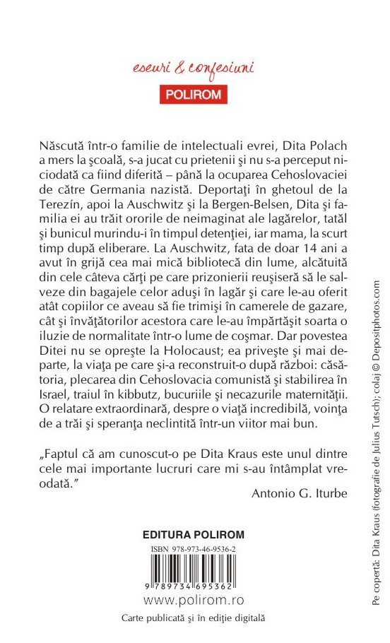 Născută într-o familie de intelectuali evrei, Dita Polach a mers la şcoală, s-a jucat cu prietenii şi nu s-a perceput niciodată ca fiind diferită – până la ocuparea Cehoslovaciei de către Germania nazistă. Deportaţi în ghetoul de la Terezín, apoi la Auschwitz şi la Bergen-Belsen, Dita şi fa-milia ei au trăit ororile de neimaginat ale lagărelor, tatăl şi bunicul murindu-i în timpul detenţiei, iar mama, la scurt timp după eliberare. La Auschwitz, fata de doar 14 ani a avut în grijă cea mai mică bibliotecă din lume, alcătuită din cele câteva cărţi pe care prizonierii reuşiseră să le salveze din bagajele celor aduşi în lagăr şi care le-au oferit atât copiilor ce aveau să fie trimişi în camerele de gazare, cât şi învăţătorilor acestora care le-au împărtăşit soarta o iluzie de normalitate într-o lume de coşmar. Dar povestea Ditei nu se opreşte la Holocaust; ea priveşte şi mai departe, la viaţa pe care şi-a reconstruit-o după război: căsătoria, plecarea din Cehoslovacia comunistă şi stabilirea în Israel, traiul în kibbutz, bucuriile şi necazurile maternităţii. O relatare extraordinară, despre o viaţă incredibilă, voinţa de a trăi şi speranţa neclintită într-un viitor mai bun.