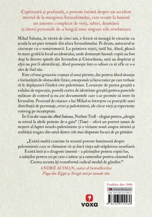 În O zi din viața lui Abed Salama, Nathan Trall – elogiat pentru „alergia sa severă la ideile primite de-a gata“ (Time) – oferă un portret uman de neșters al luptei israelo-palestiniene și o viziune nouă asupra istoriei și realității tragice din unul dintre cele mai disputate locuri de pe pământ.