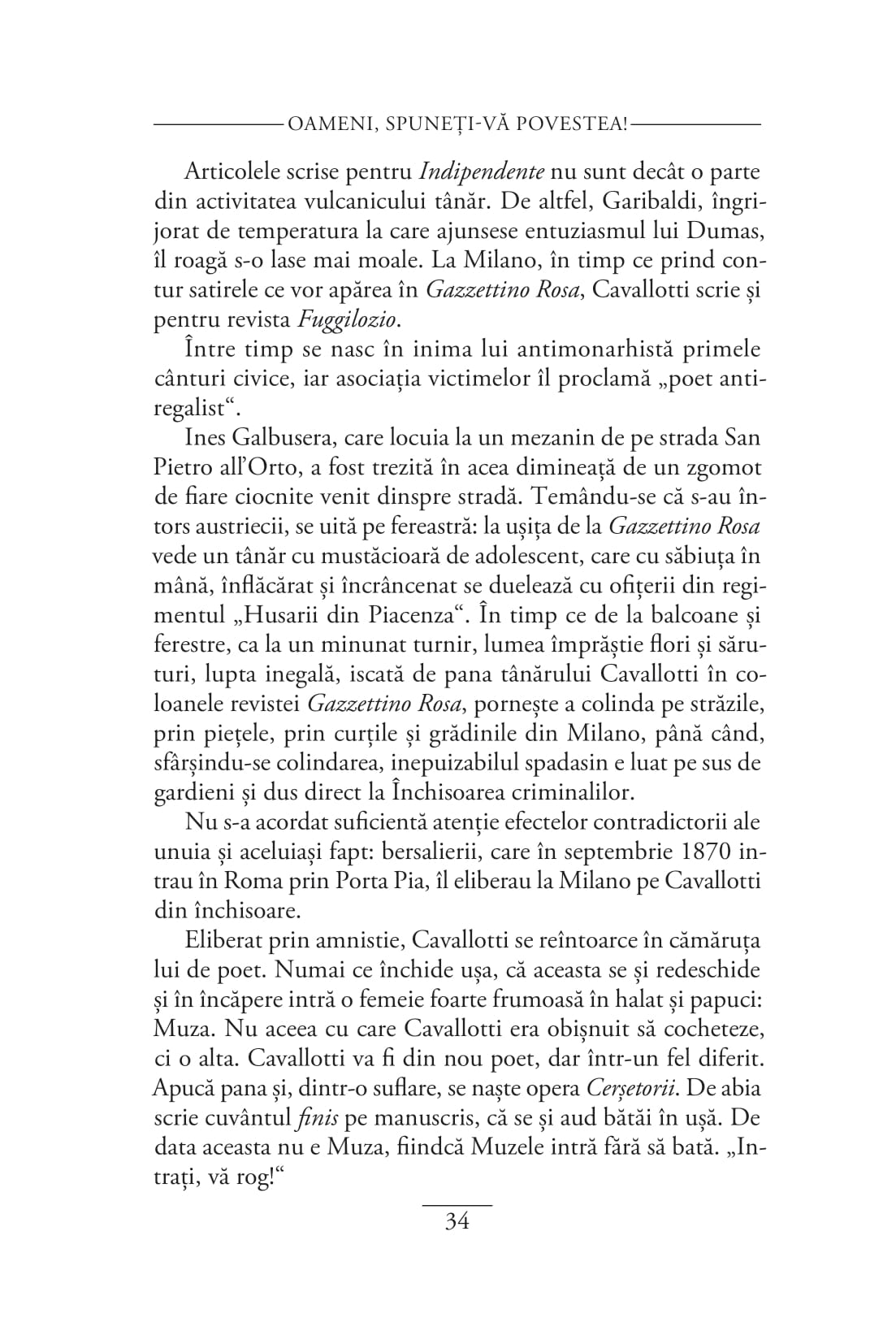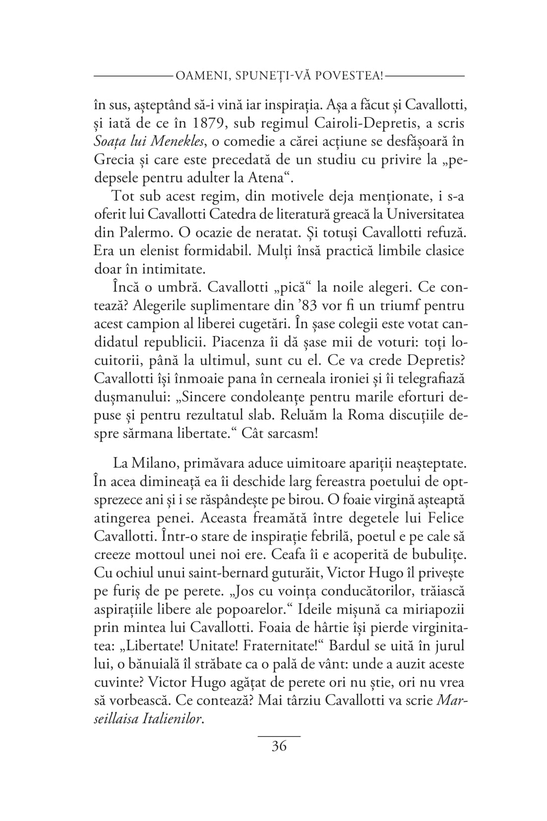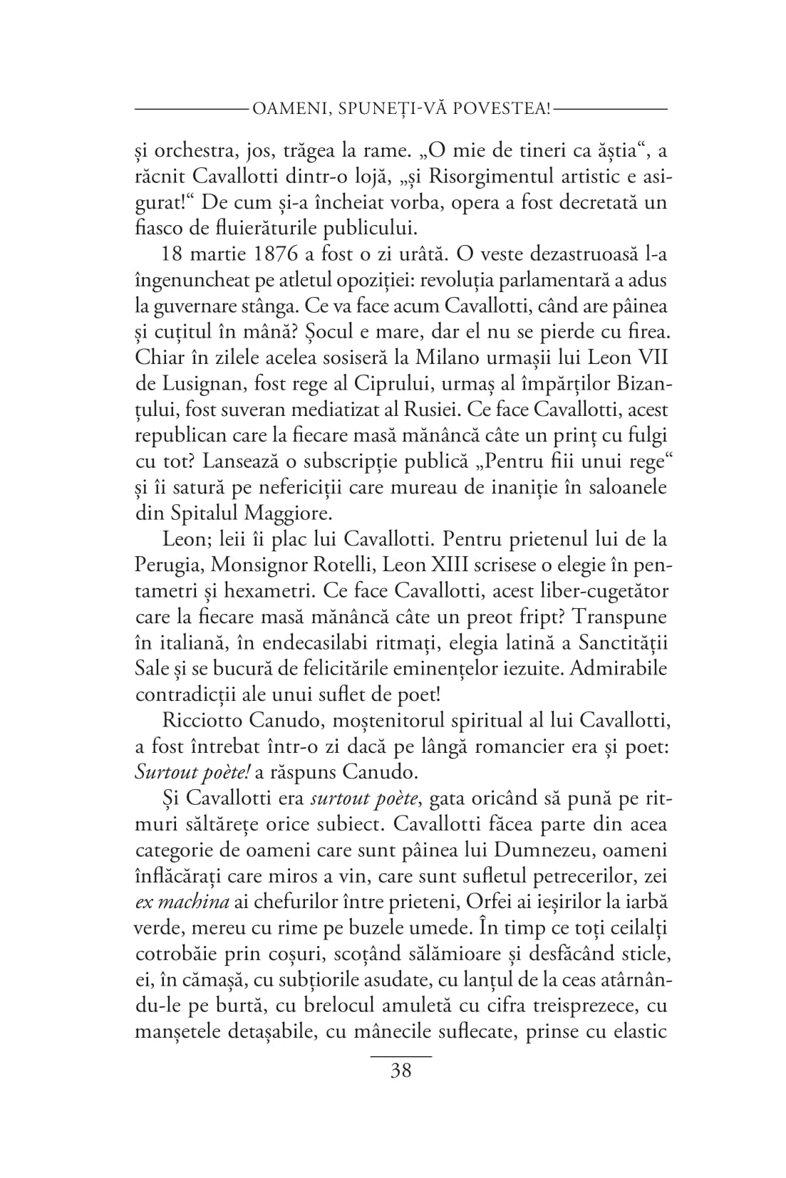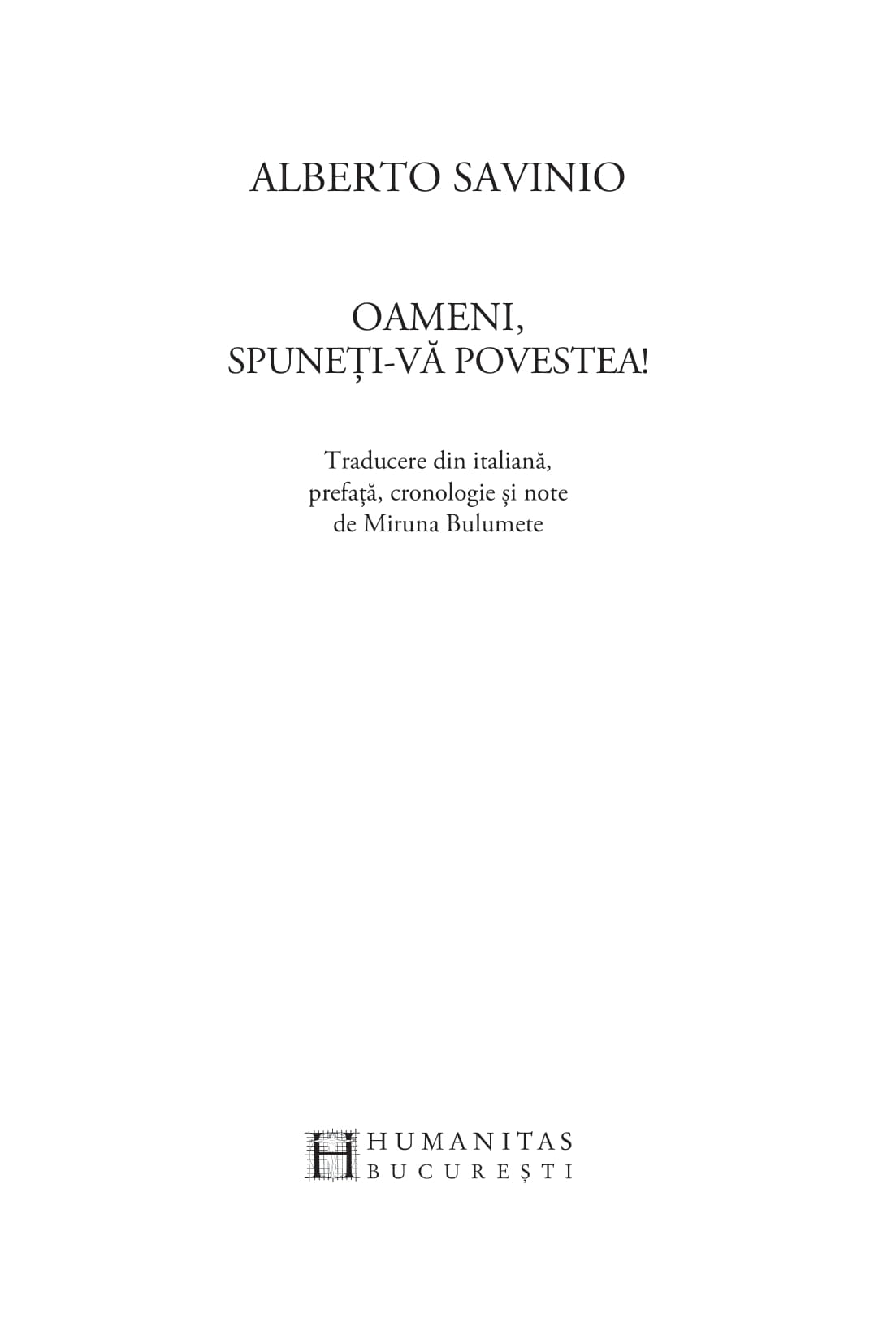 „Romancier, nuvelist, poet, dramaturg, eseist, jurnalist, pictor, pianist, compozitor, muzicolog și regizor, Alberto Savinio (pe numele lui Andrea De Chirico) a fost un artist extraordinar de prolific, al cărui geniu a fost imediat recunoscut de unele dintre cele mai importante personalități culturale ale începutului de secol XX. Capodopera lui Savinio, Oameni, spuneți-vă povestea!, reunește paisprezece nuvele-biografii, scrise cu vioiciune, umor, fantezie și, mai presus de toate, cu o extraordinară căldură umană, menită să dezvăluie firescul și măreția celebrilor săi protagoniști, «scufundați, unii mai mult, alții mai puțin, în gelatina istoriei»: între ei, Nostradamus, Paracelsus, Jules Verne, Collodi, Apollinaire, Verdi și Isadora Duncan. Nuvelele lui Savinio ne propun astfel acea tensiune constantă între cotidian, cu circumstanțele și constrângerile lui lumești, și Marele Timp al eternelor reîntoarceri, între istorie și orizontul transistoric și transindividual în care personajele devin nemuritoare.“ — MIRUNA BULUMETE