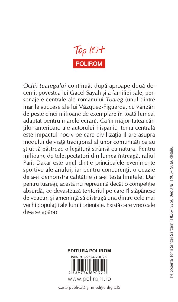 Ochii tuaregului continuă, după aproape două decenii, povestea lui Gacel Sayah şi a familiei sale, personajele centrale ale romanului Tuareg (unul dintre marile succese ale lui Vázquez-Figueroa, cu vânzări de peste cinci milioane de exemplare în toată lumea, adaptat pentru marele ecran). Ca în majoritatea cărţilor anterioare ale autorului hispanic, tema centrală este impactul nociv pe care civilizaţia îl are asupra modului de viaţă tradiţional al unor comunităţi ce au ştiut să păstreze o legătură strânsă cu natura. Pentru milioane de telespectatori din lumea întreagă, raliul Paris-Dakar este unul dintre principalele evenimente sportive ale anului, iar pentru concurenţi, o ocazie de a-şi demonstra calităţile şi a-şi testa limitele. Dar pentru tuaregi, acesta nu reprezintă decât o competiţie absurdă, ce devastează teritoriul pe care îl stăpânesc de veacuri şi ameninţă să distrugă una dintre cele mai vechi populaţii ale lumii orientale. Există oare vreo cale de-a se apăra?