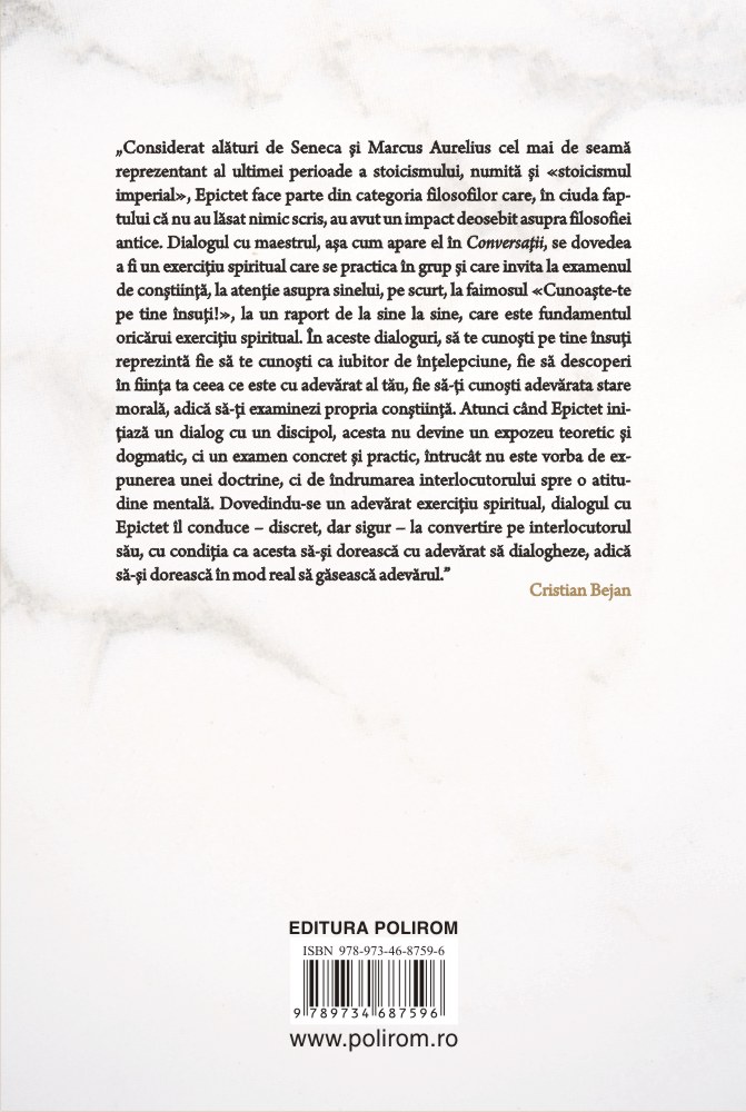 „Considerat alături de Seneca și Marcus Aurelius cel mai de seamă reprezentant al ultimei perioade a stoicismului, numită și «stoicismul imperial», Epictet face parte din categoria filosofilor care, în ciuda faptului că nu au lăsat nimic scris, au avut un impact deosebit asupra filosofiei antice. Dialogul cu maestrul, așa cum apare el în Conversaţii, se dovedea a fi un exerciţiu spiritual care se practica în grup și care invita la examenul de conștiinţă, la atenţie asupra sinelui, pe scurt, la faimosul «Cunoaște‑te pe tine însuţi!», la un raport de la sine la sine, care este fundamentul oricărui exerciţiu spiritual. În aceste dialoguri, să te cunoști pe tine însuţi reprezintă fie să te cunoști ca iubitor de înţelepciune, fie să descoperi în fiinţa ta ceea ce este cu adevărat al tău, fie să‑ţi cunoști adevărata stare morală, adică să‑ţi examinezi propria conștiinţă. Atunci când Epictet iniţiază un dialog cu un discipol, acesta nu devine un expozeu teoretic și dogmatic, ci un examen concret și practic, întrucât nu este vorba de expunerea unei doctrine, ci de îndrumarea interlocutorului spre o atitudine mentală. Dovedindu‑se un adevărat exerciţiu spiritual, dialogul cu Epictet îl conduce – discret, dar sigur – la convertire pe interlocutorul său, cu condiţia ca acesta să‑și dorească cu adevărat să dialogheze, adică să‑și dorească în mod real să găsească adevărul.” (Cristian Bejan)