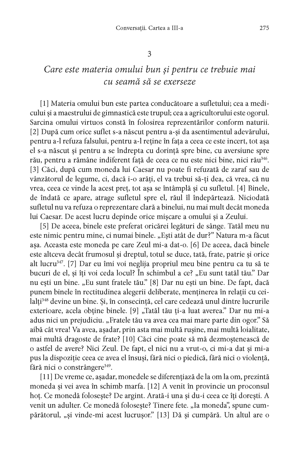 „Omule, tu ai o facultate de a alege, care în mod natural nu poate fi împiedicată și nici supusă vreunui obstacol. Acest lucru este scris aici, în măruntaie. Eu ţi-l voi demonstra mai întâi în ceea ce privește domeniul asentimentului. Poate oare cineva să te împiedice să-ţi dai asentimentul unui lucru adevărat? Nimeni. Poate oare cineva să te forţeze să accepţi falsul? Nimeni. Vezi că în acest domeniu alegerea ta deliberată este de neîmpiedicat, nesupusă nici unui obstacol și lipsită de capcane. Ei bine, în domeniul dorinţei și al impulsului, lucrurile stau altfel? Cine poate să învingă un impuls, dacă nu un nou impuls? Cine poate să învingă o dorinţă sau o aversiune, dacă nu o nouă dorinţă și o nouă aversiune?” (Conversaţii, I, 17, 21-24)