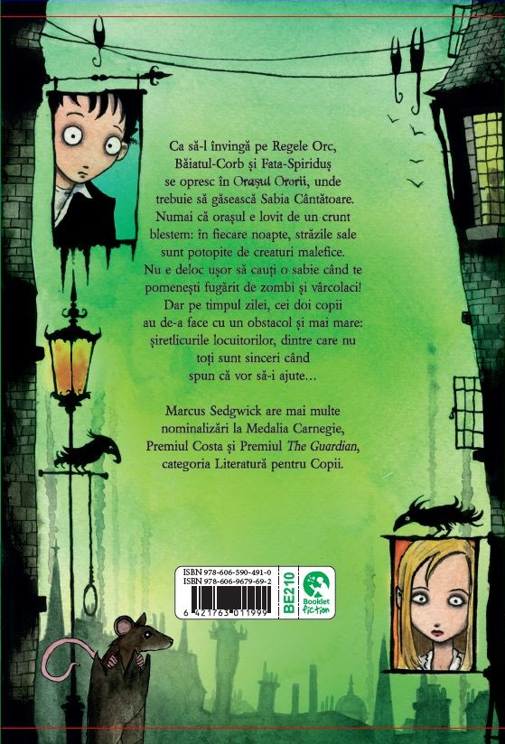 Ca sa-I invinga pe Regele Orc, Baiatul-Corb si Fata-Spiridus se opresc in Orasul Ororii, unde trebuie sa gaseasca Sabia Cantatoare. Numai ca orasul e lovit de un crunt blestem: in fiecare noapte, strazile sale sunt potopite de creaturi malefice. Nu e deloc usor sa cauti o sabie cand te pomenesti fugarit de zombi si varcolaci! Dar pe timpul zilei, cei doi copii au de-a face cu un obstacol si mai mare: siretlicurile locuitorilor, dintre care nu toti sunt sinceri cand spun ca vor sa-i ajute...