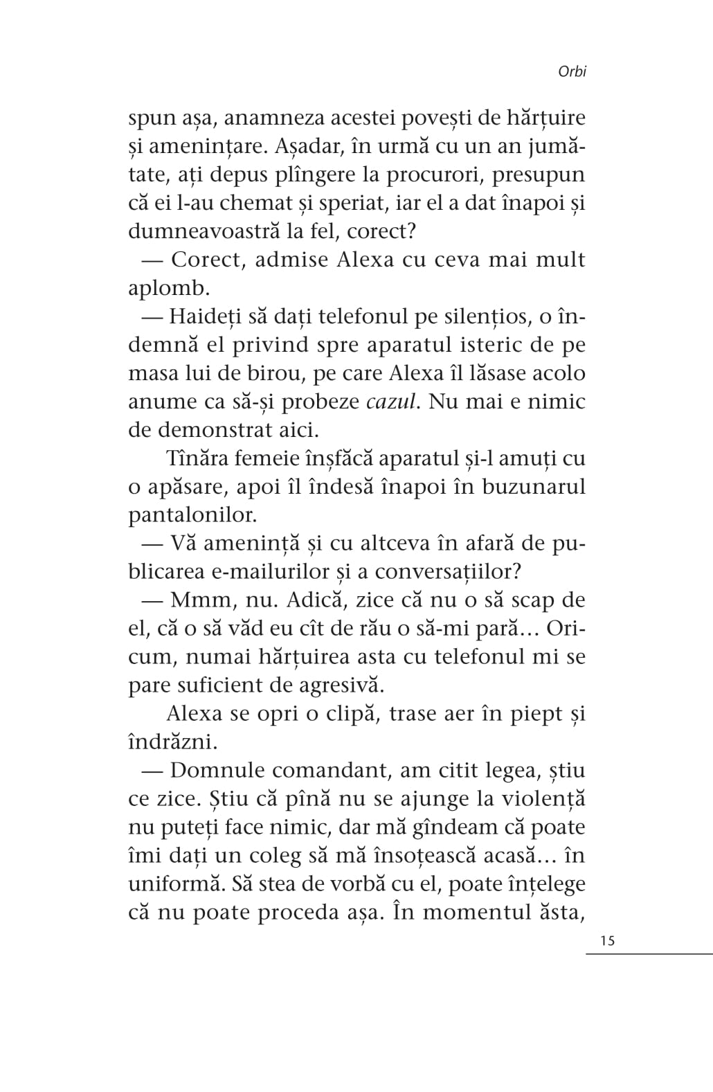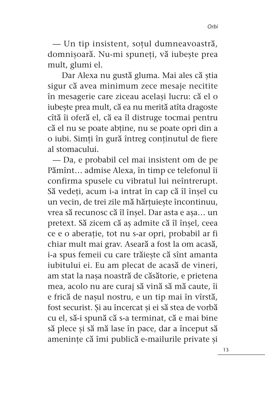 „Nu știu ce-nseamnă să nu vezi cu ochii, dar știu ce-nseamnă să-ți orbești inima, cu tot sângele ei, să-i dai peste gura instinctului care urla „Nu!", să-ți înveți mintea să-ți justifice drumul în jos. Această carte mi-a spart în față o oglindă și m-am văzut bucăți în toate cioburile ei (…) Ca să te-ntorci la tine, ca altă cale nu e, iubește-te-n fărâmă, deschide pleoapa ei, cum zice Petronela în cartea asta pulsândă, răvășitor de necesară…" Ana Barton