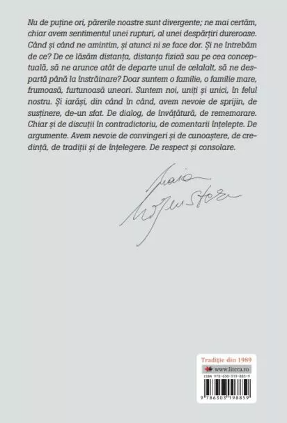 De dialog, de învăţătură, de rememorare. Chiar şi de discuţii în contradictoriu, de comentarii înţelepte. De argumente. Avem nevoie de convingeri şi de cunoaştere, de cre dinţă, de tradiţii şi de înţelegere. De respect şi consolare. Maia Morgenstern