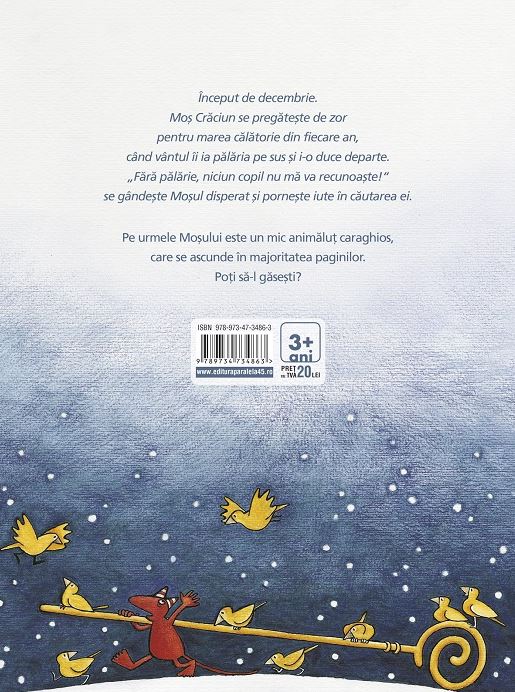 Început de decembrie. Moş Crăciun se pregătește de zor pentru marea călătorie din fiecare an, când vântul îi ia pălăria pe sus şi i-o duce departe. „Fără pălărie, niciun copil nu mă va recunoaște!“ se gândește Moșul disperat și pornește iute în căutarea ei. Pe urmele Moșului este un mic animăluț caraghios, care se ascunde în majoritatea paginilor. Poți să-l găsești?