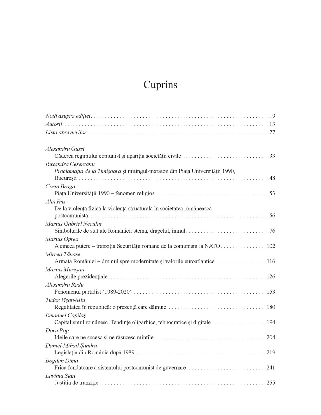 „Ce urmează căderii regimului comunist? O lungă perioadă de tranziţie, numită generic postcomunism. Putem spune că cele trei decenii de după 1989 nu sunt doar o cifră rotundă, ci o epocă, una încheiată, mai întâi de pandemia universală, care a schimbat lumea, aducând în discuţie sintagme precum «lume postpandemică», apoi de atacul armat al Rusiei asupra Ucrainei (care încă nu s-a încheiat!), şi constituie deja o perioadă istorică distinctă pe care o putem analiza şi la care ne putem raporta – chiar dacă, de multe ori, o facem cu subiectivitatea unor martori şi participanţi direcţi la evenimentele/fenomenele în discuţie. Dacă despre comunism s-a scris mult, sinteze privind postcomunismul, precum cartea de faţă, nu existau până acum. În mod firesc, mai mult de jumătate din subiectele volumului de faţă sunt succesoarele celor din Panorama comunismului în România (Polirom, 2020): simboluri de stat, educaţie, economie, literatură, muzică, teatru, film, relaţii internaţionale, servicii secrete, religie, viaţă cotidiană ş.a. Altele au fost adaptate noilor realităţi, de pildă studiile despre alegerile prezidenţiale şi fenomenul partidist în locul celor despre Partidul Comunist şi liderii lui. Unele teme au dispărut (colectivizare, deportări, disidenţă etc.), dar au fost înlocuite de altele noi (apariţia societăţii civile, fenomenul Piaţa Universităţii, capitalismul românesc, organizaţiile societăţii civile, mediul şi protecţia acestuia, migraţia, cultura digitală ş.a.). Cei 48 de autori, reputaţi specialişti, profesori universitari, cercetători în principalele instituţii ştiinţifice din România, dar şi din diaspora, analizează schimbările din cele mai importante domenii sociopolitice şi culturale, într-o vastă şi incitantă Panoramă a postcomunismului în România, document de referinţă al acestei perioade şi instrument pentru o mai bună înţelegere a vremurilor în care trăim.” (Liliana Corobca)